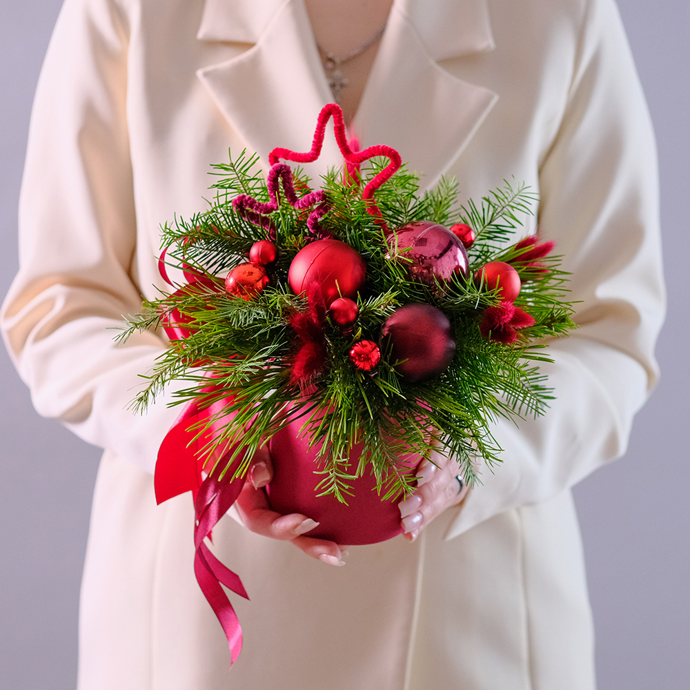 Яркая новогодняя композиция с елочными шарами, настоящей хвоей и декором.