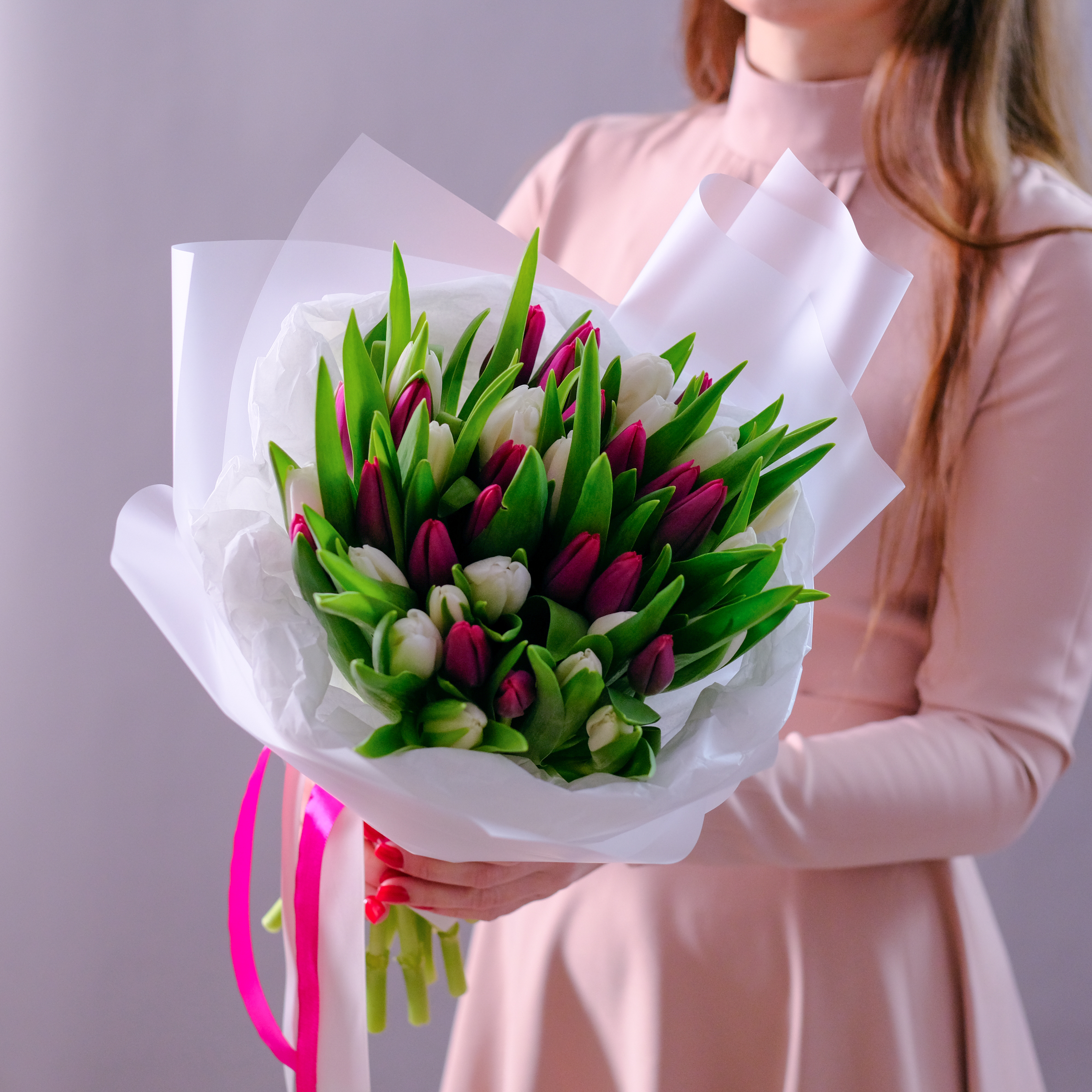 Состав: тюльпан белый, тюльпан фиолетовый (пурпурный, темно-розовый, малиновый)