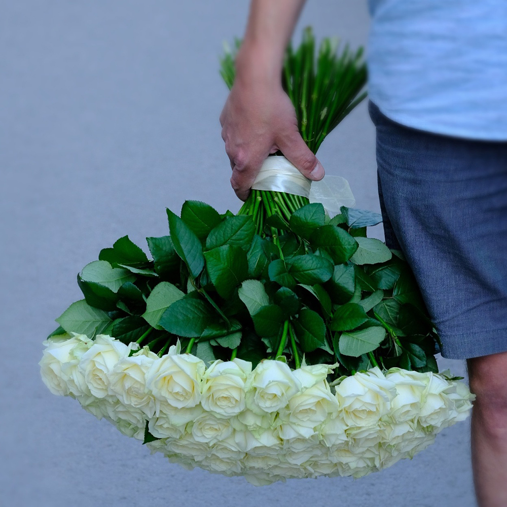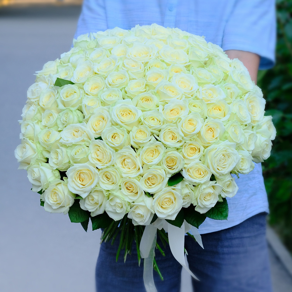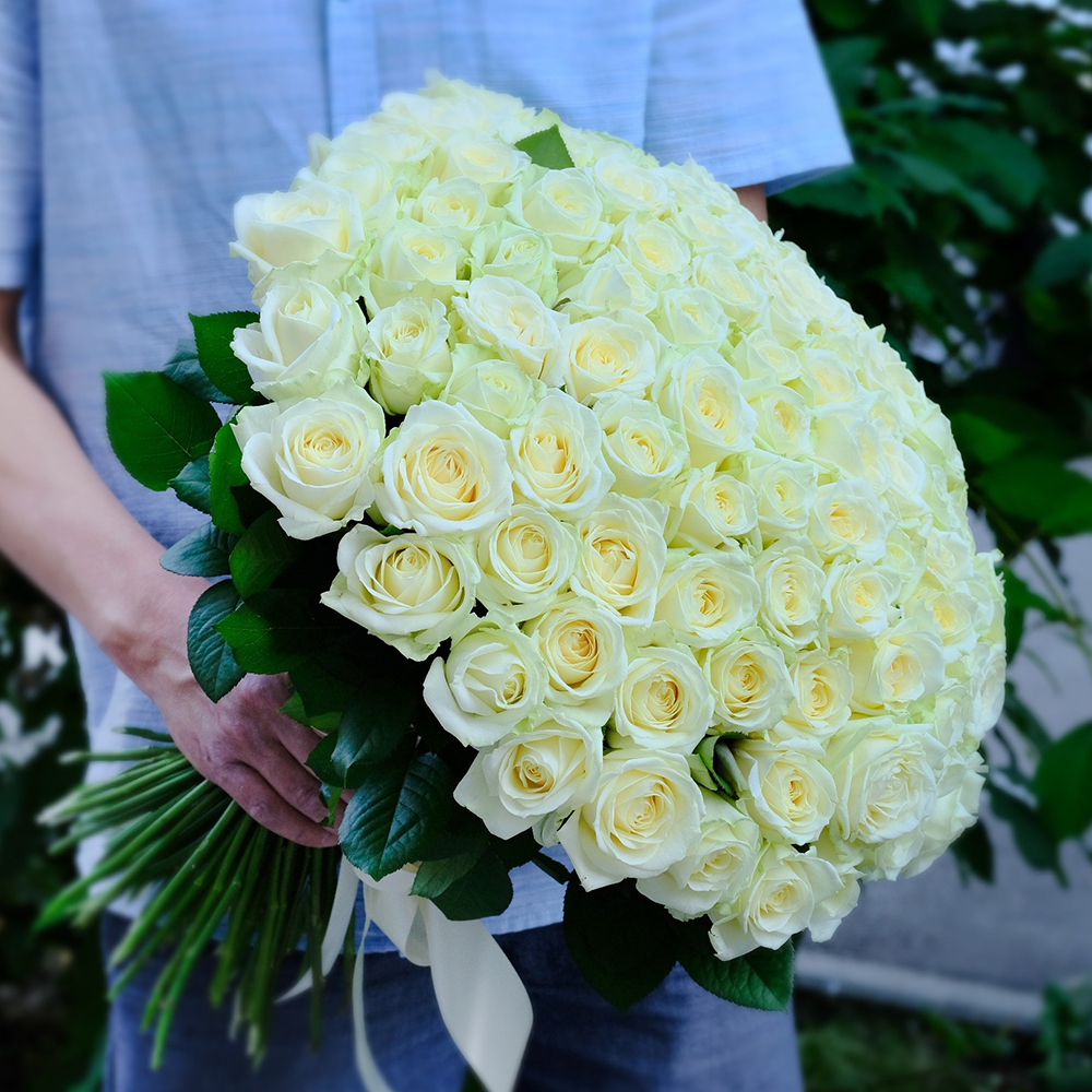 На фотографии представлен букет из 101 розы Аваланш, высота стебля 50см, без оформления.
