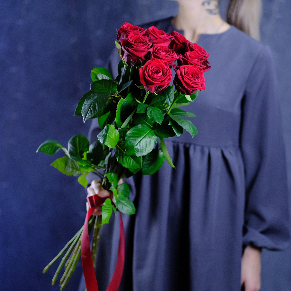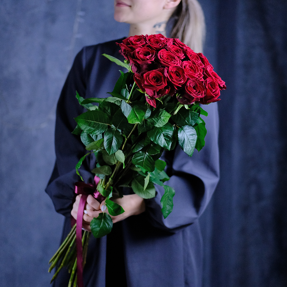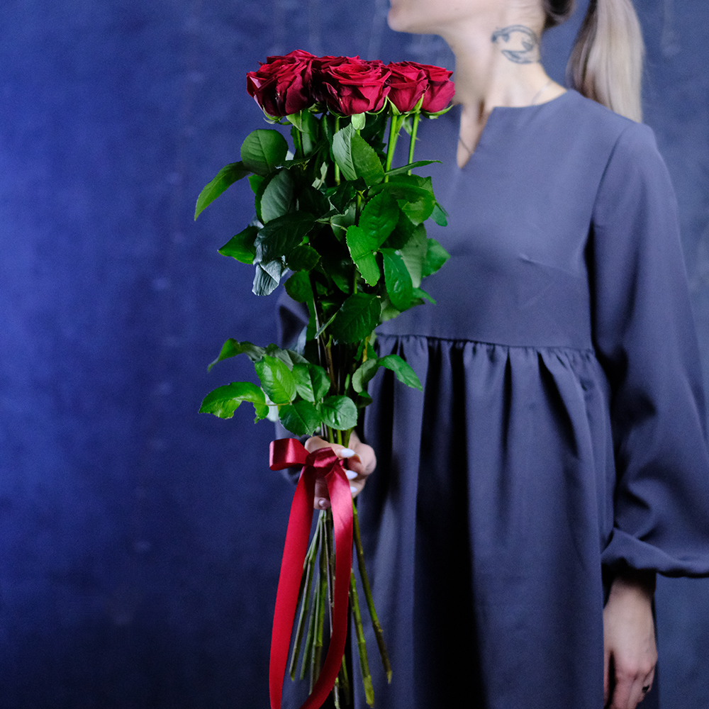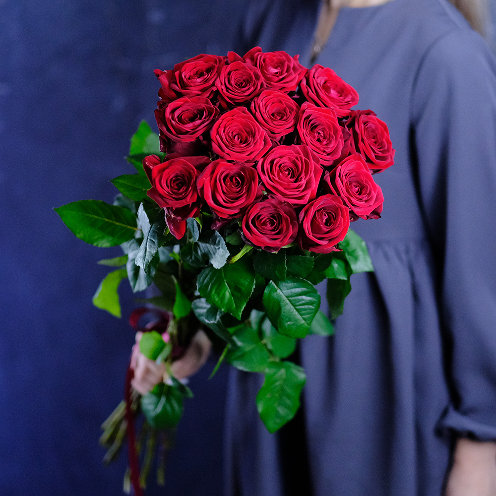 Сорт Red Naomi (Ред Наоми), цвет красный, производство Россия. Возможна замена на другие красные сорта роз: Престиж, Мери Ми, Гран При. Насыщенность цвета, форма бокала, степень раскрытия бутона могут различаться.