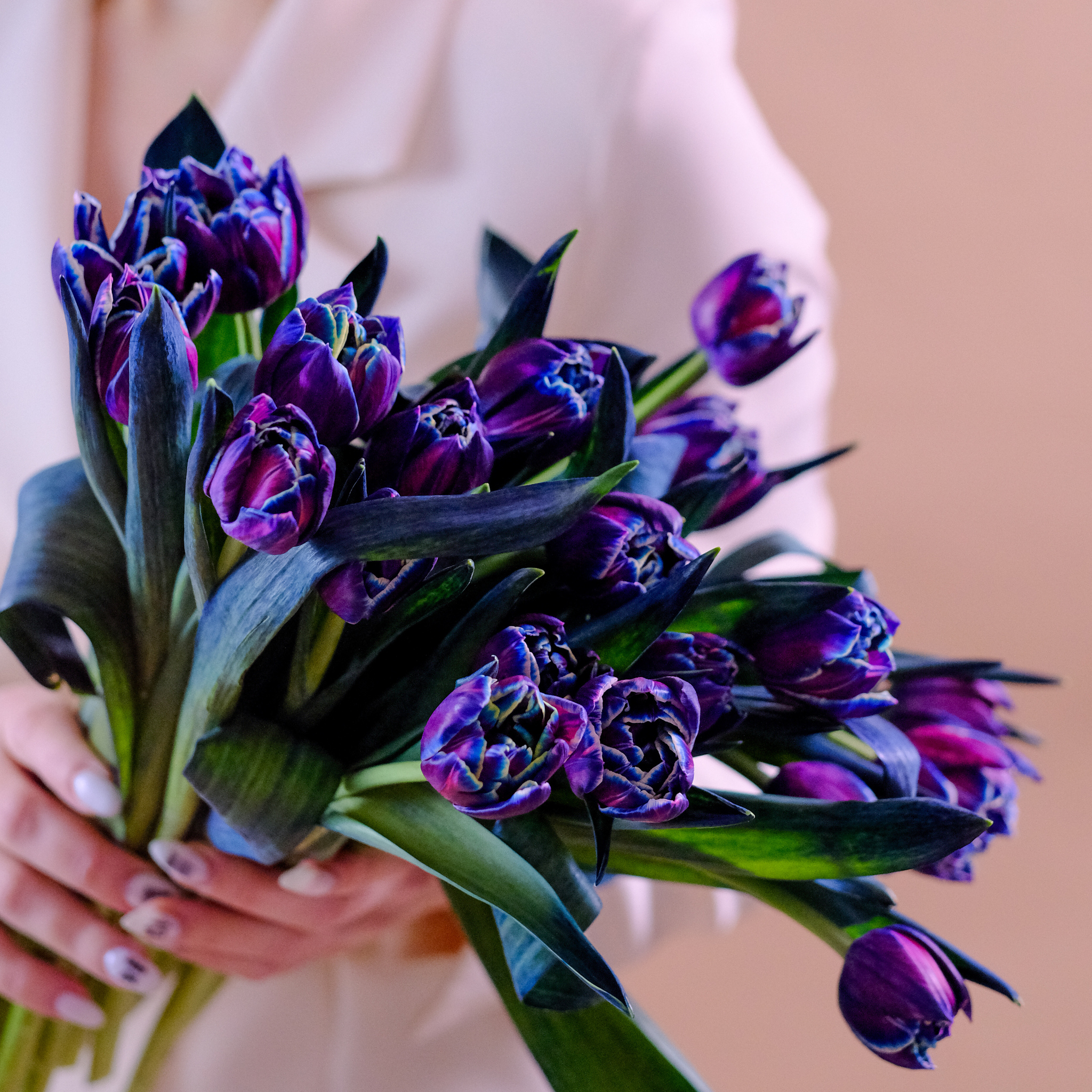 Тюльпан премиум-класса пионовидный, махровый, цвет фиолетовый. Оттенки и форма бутона могут различаться.