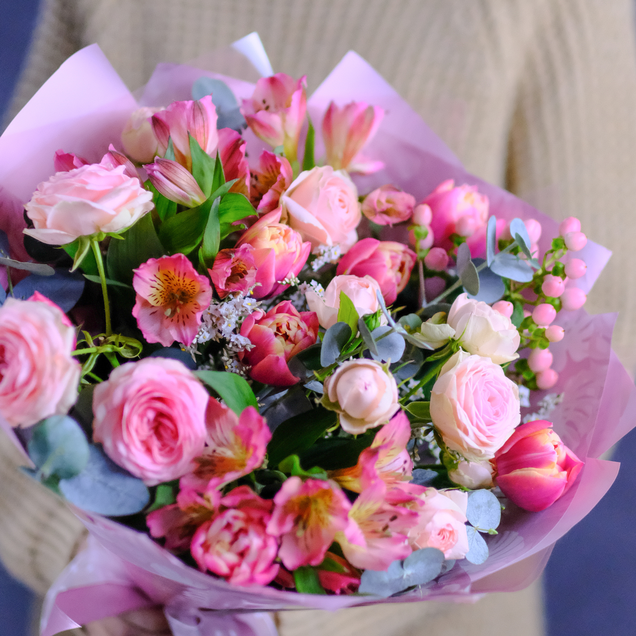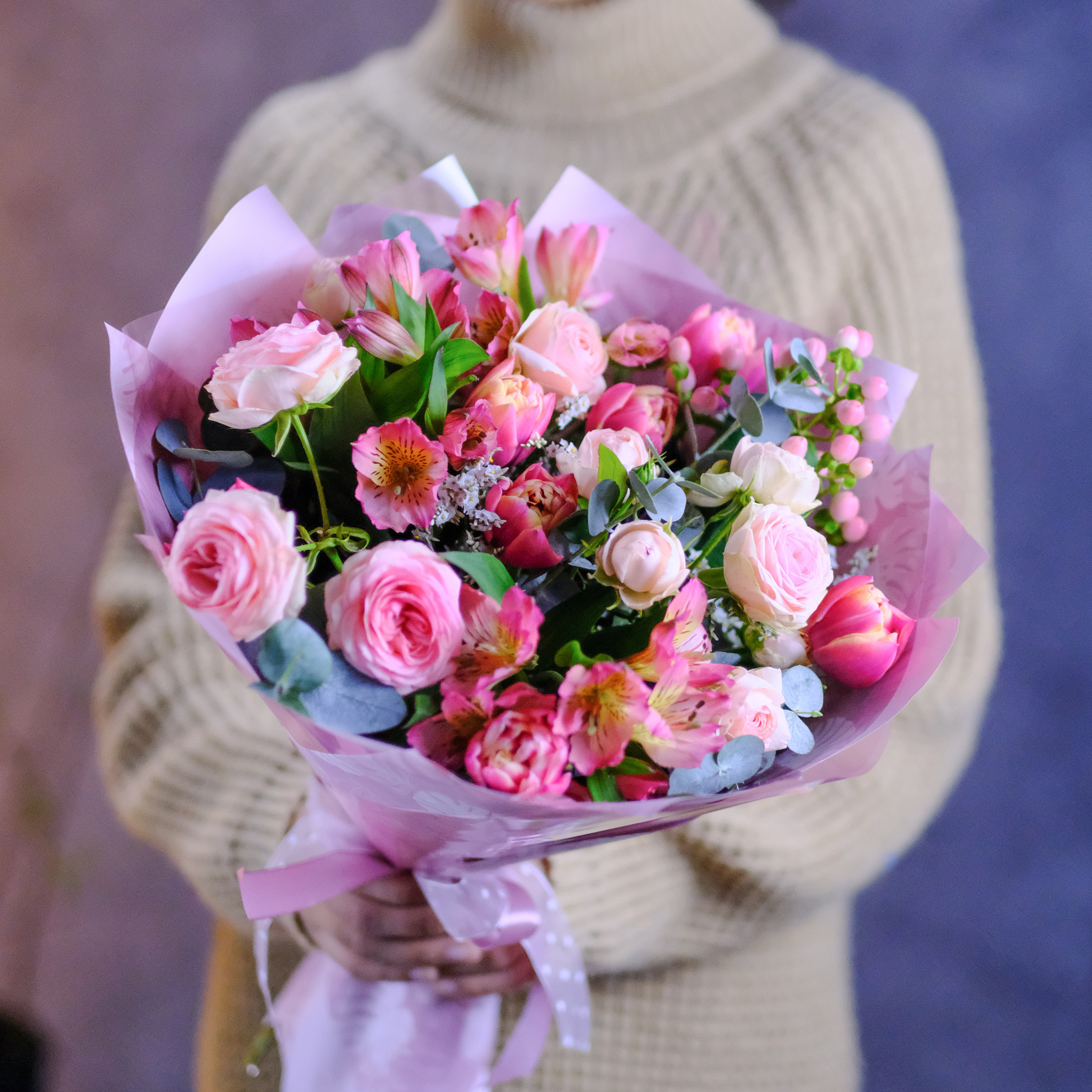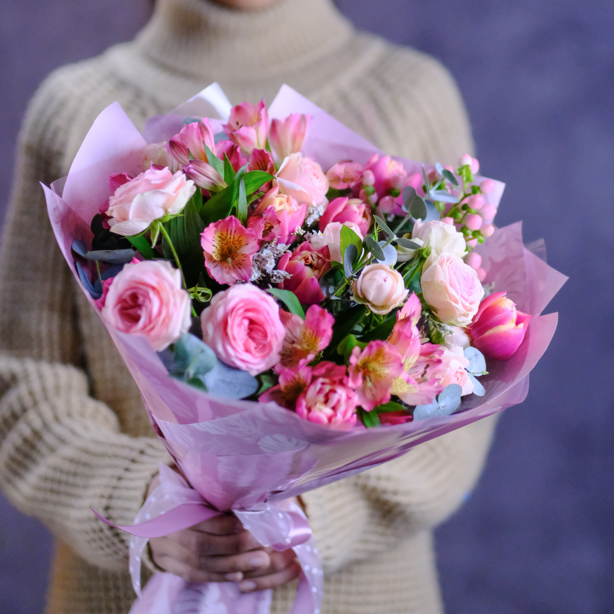 Букет #371 с пионовидными розами и тюльпанами