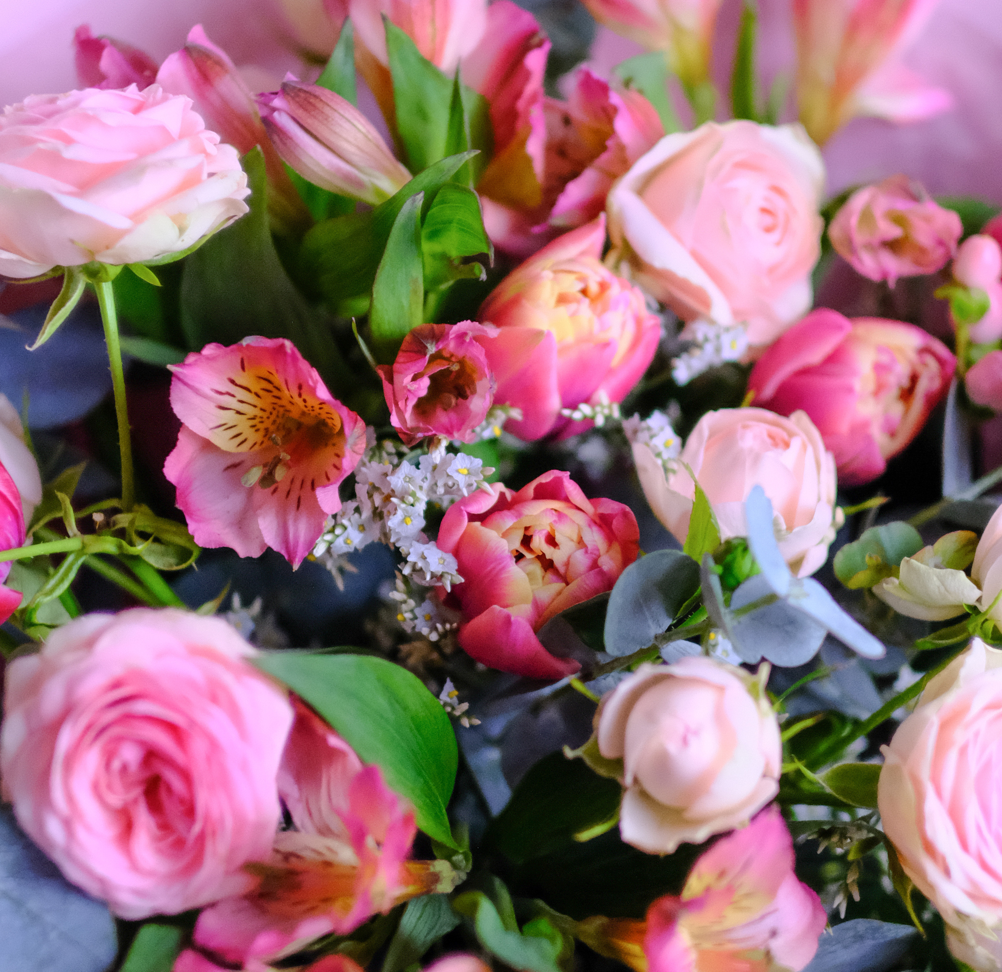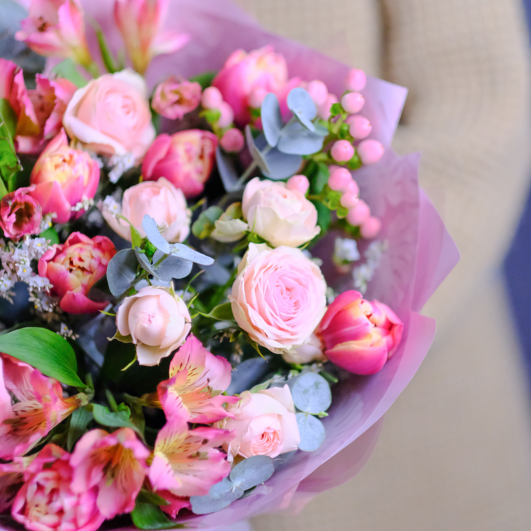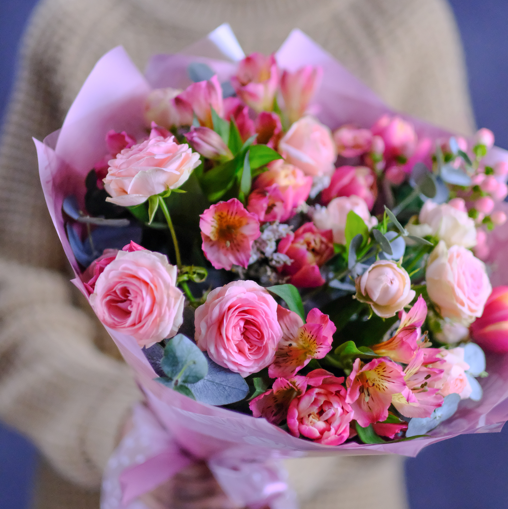 Букет #371 с пионовидными розами и тюльпанами