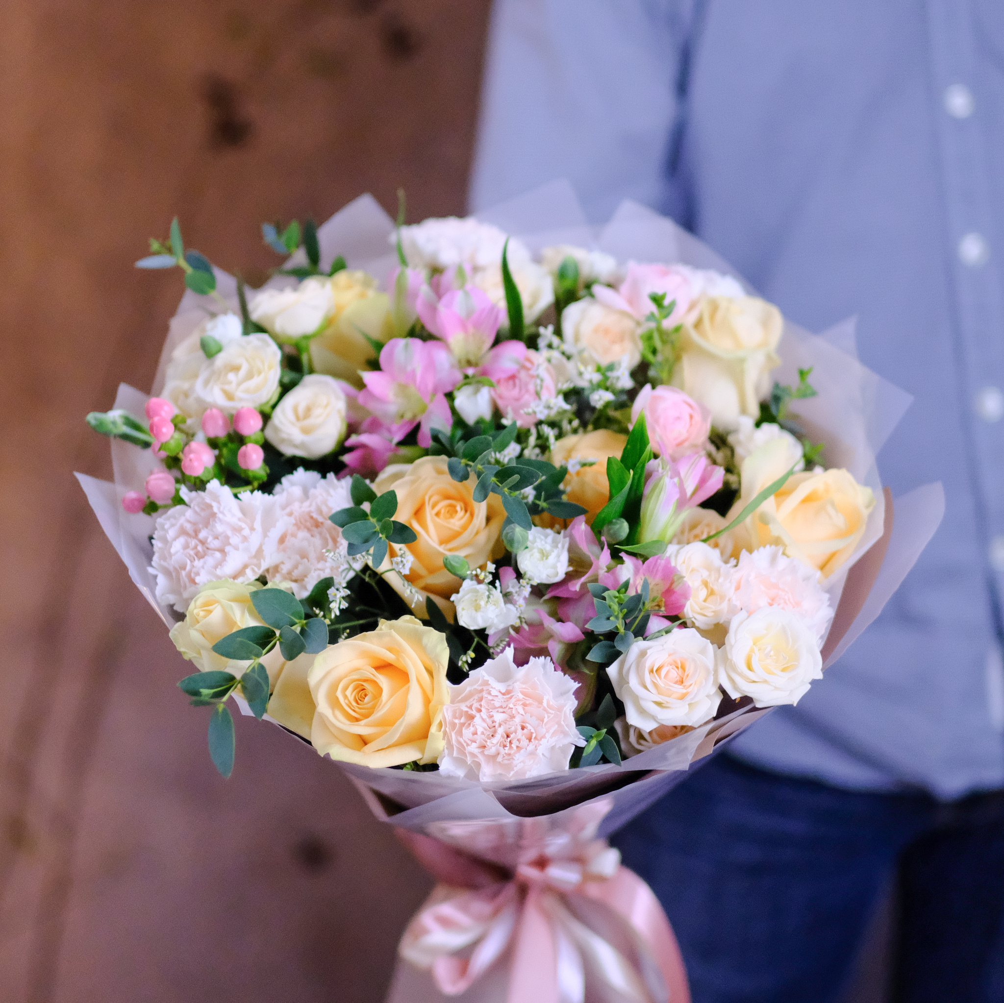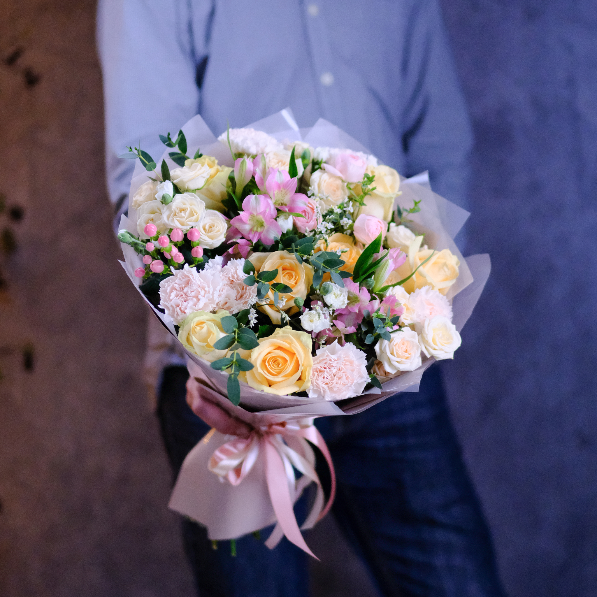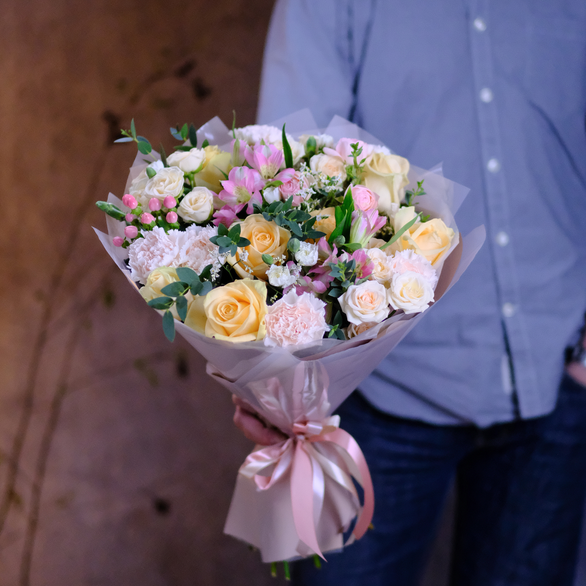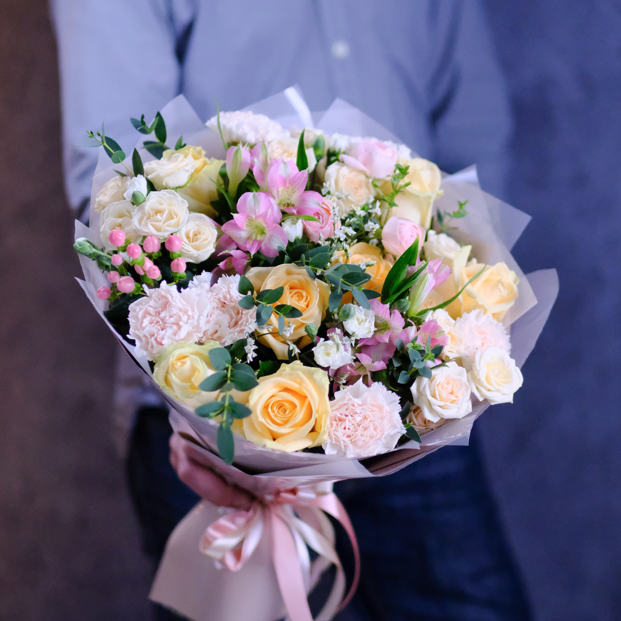 Важно! В случае отсутствия необходимых цветов состав букета определяется флористом на свое усмотрение с сохранением цветовой гаммы, фактуры и стилистики букета в соответствии с Положением. Если у Вас есть особые пожелания, пожалуйста, согласуйте их с флористом по телефону 8 (909) 119-119-2 или с помощью онлайн-консультанта.