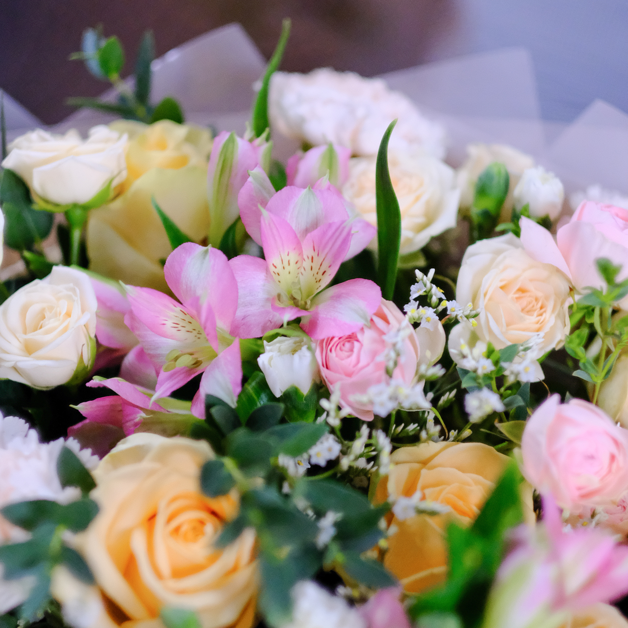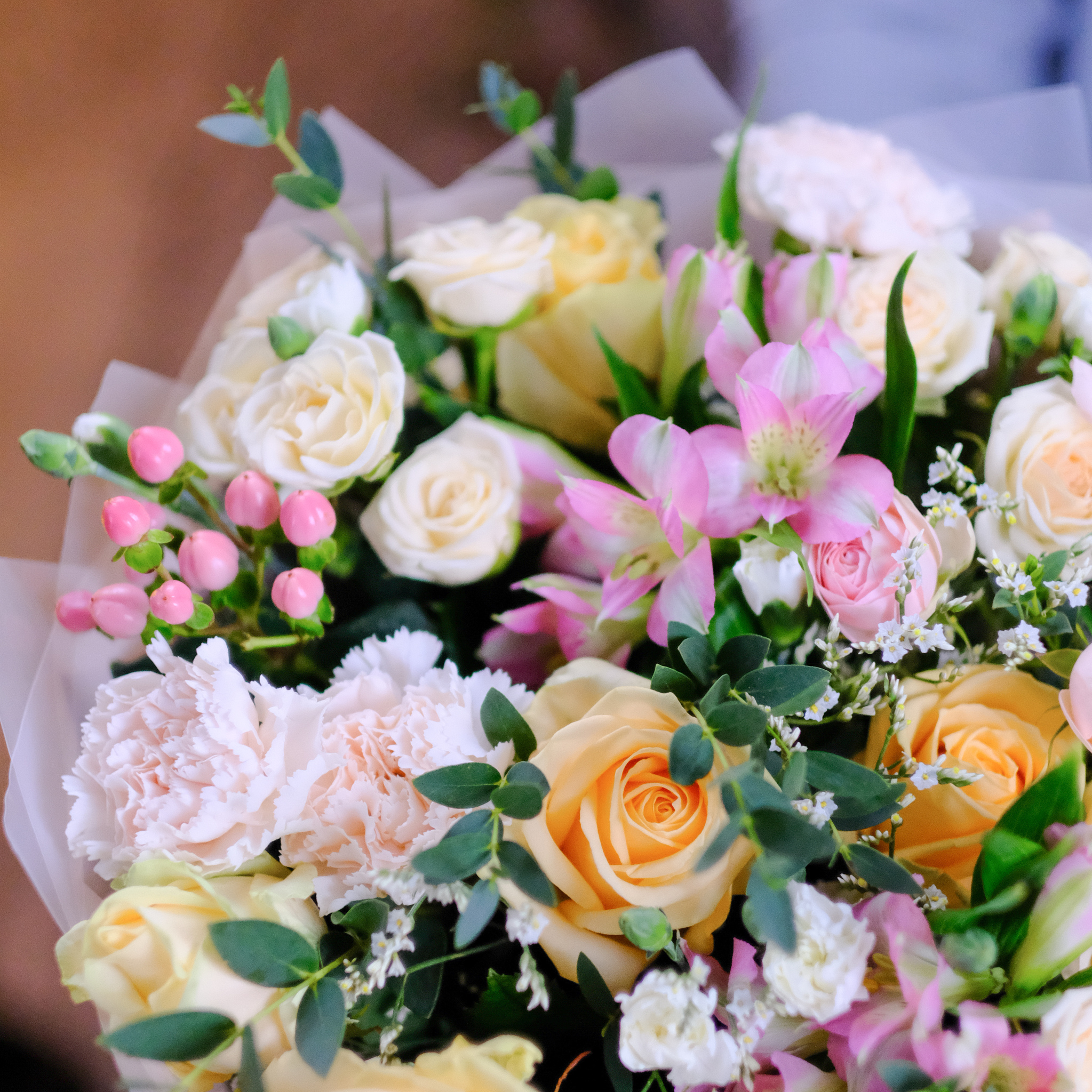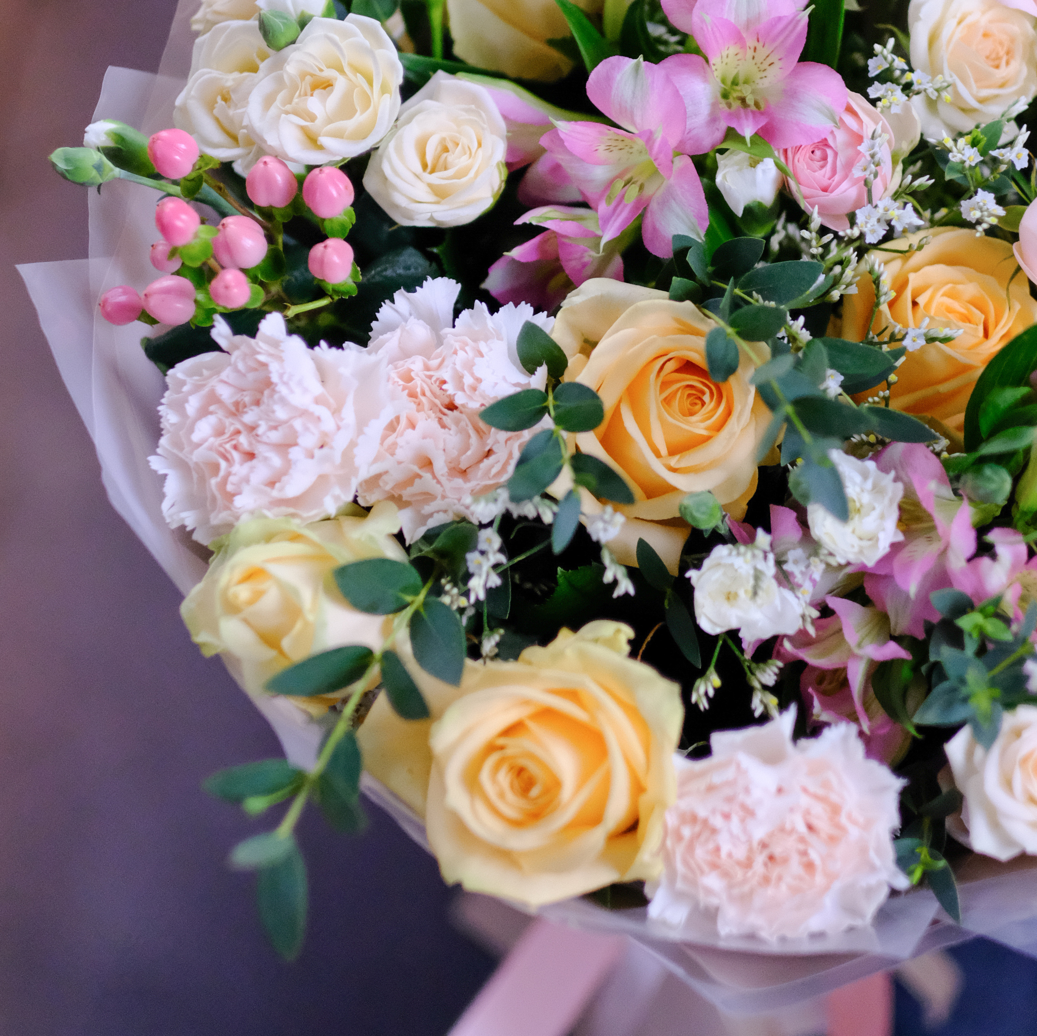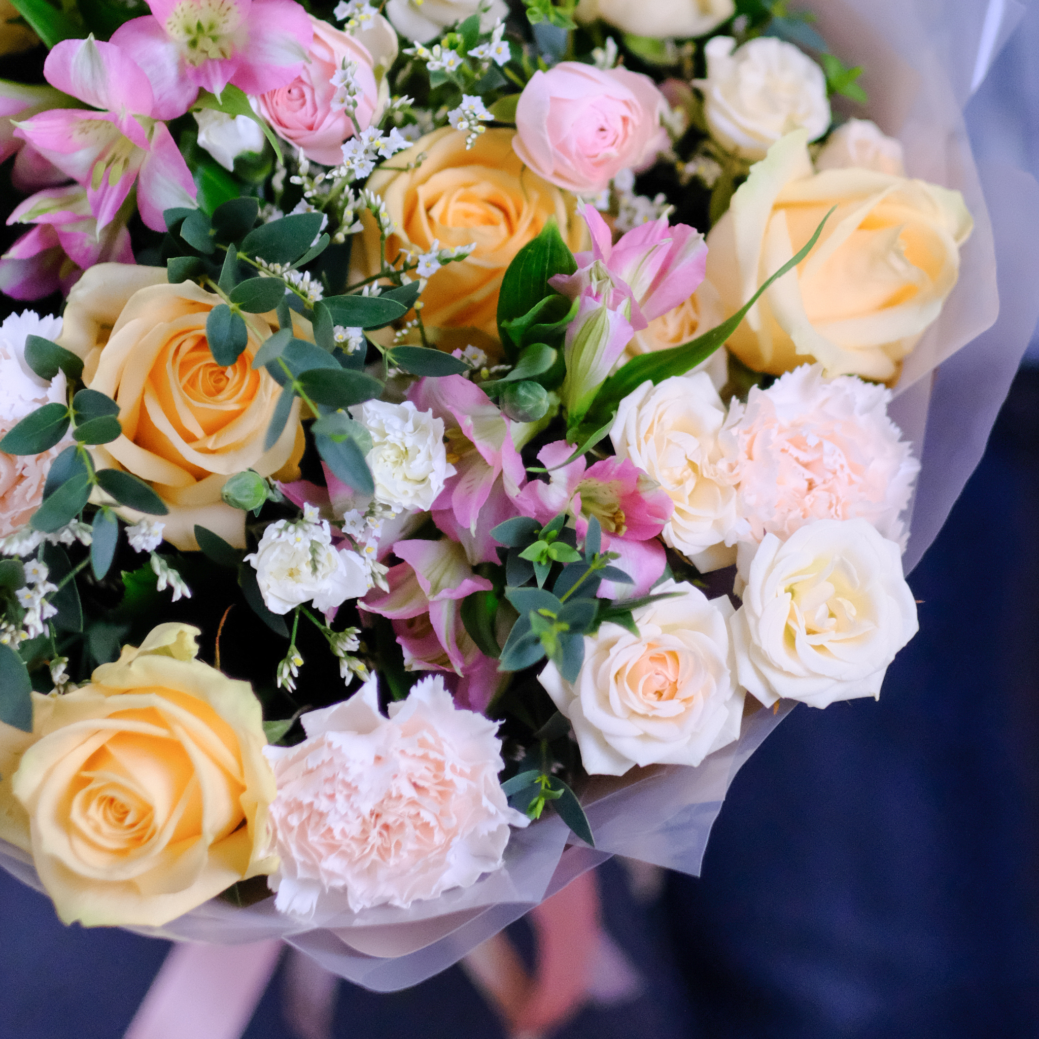 Важно! В случае отсутствия необходимых цветов состав букета определяется флористом на свое усмотрение с сохранением цветовой гаммы, фактуры и стилистики букета в соответствии с Положением. Если у Вас есть особые пожелания, пожалуйста, согласуйте их с флористом по телефону 8 (909) 119-119-2 или с помощью онлайн-консультанта.