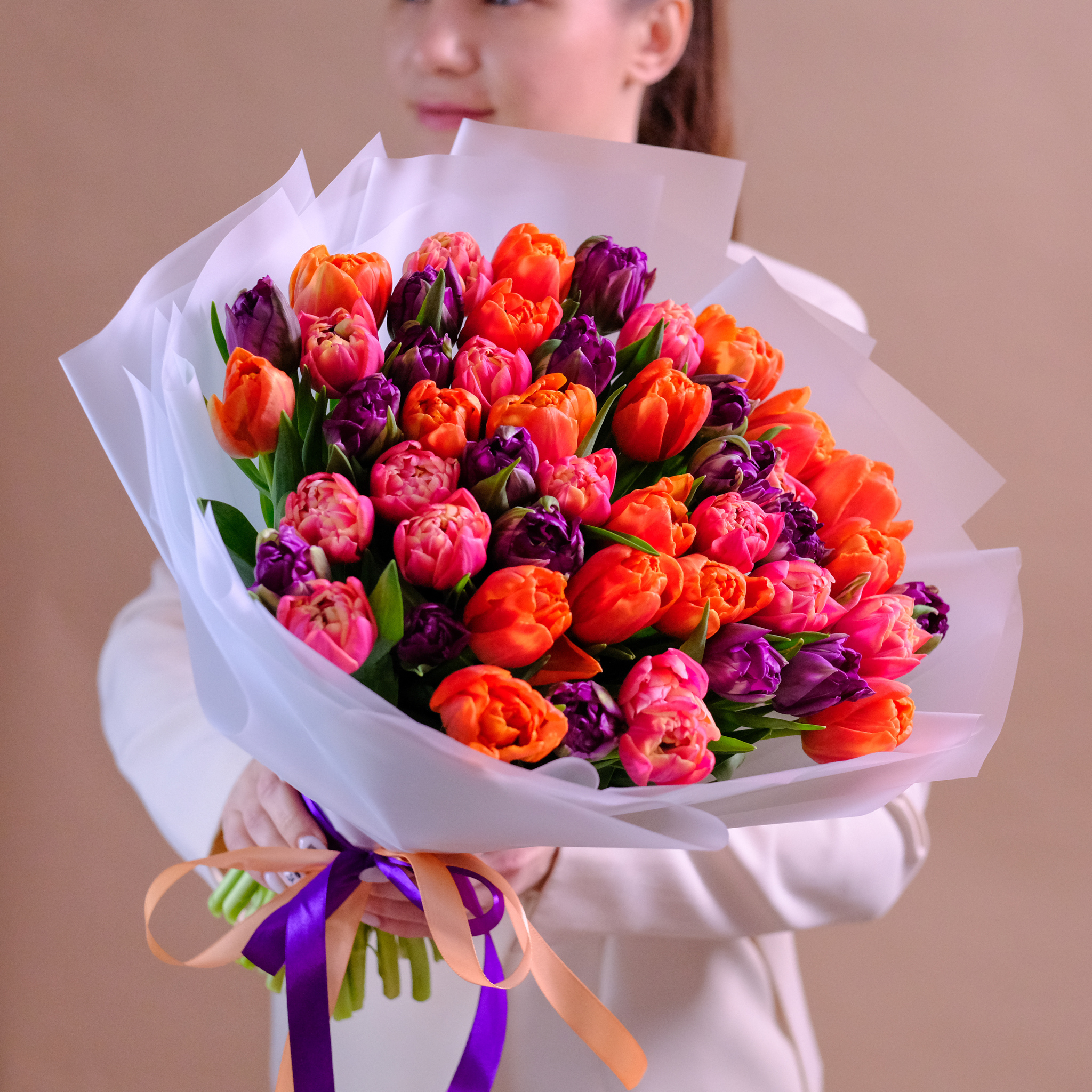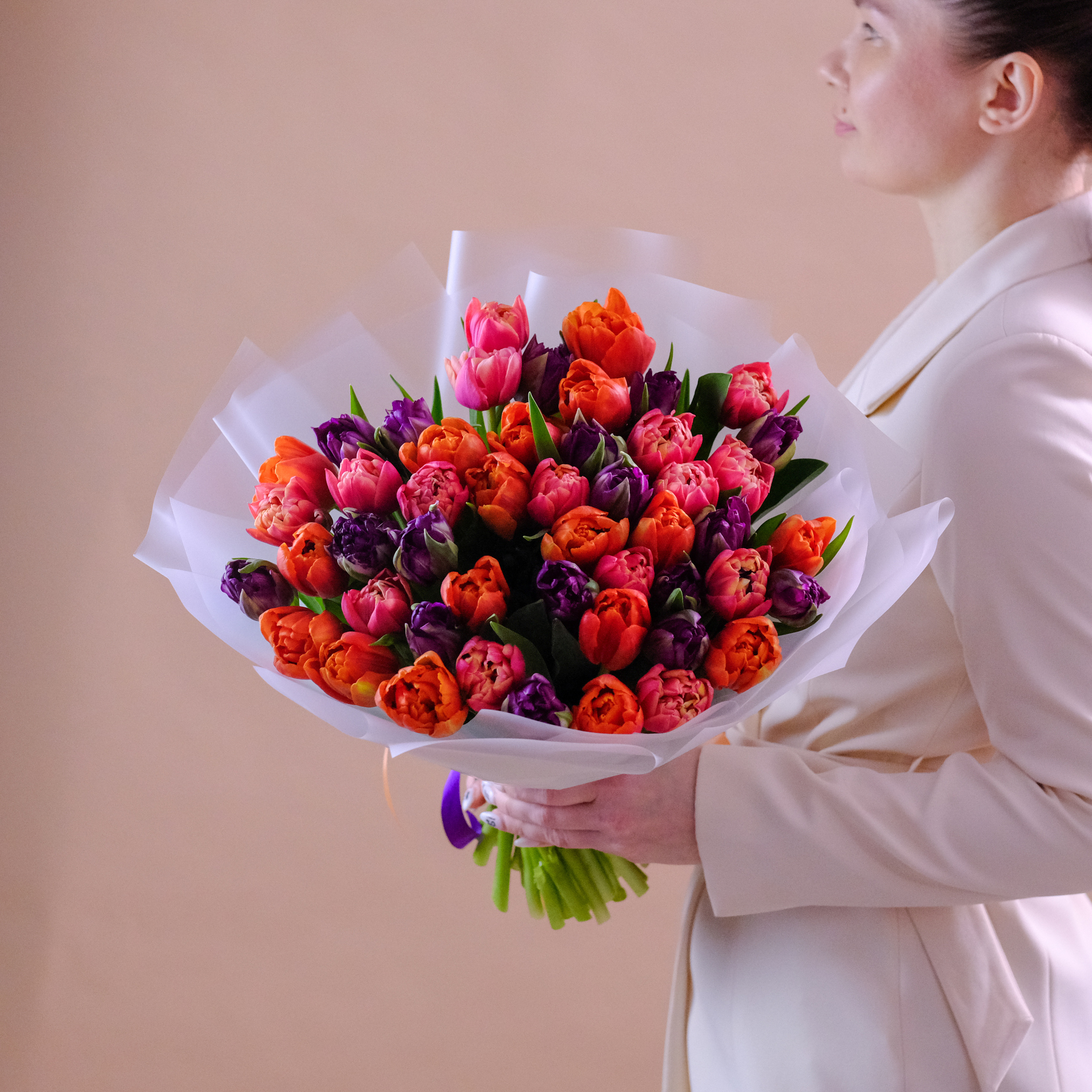 На фотографии представлен букет из 51 пионовидного тюльпана микс.
