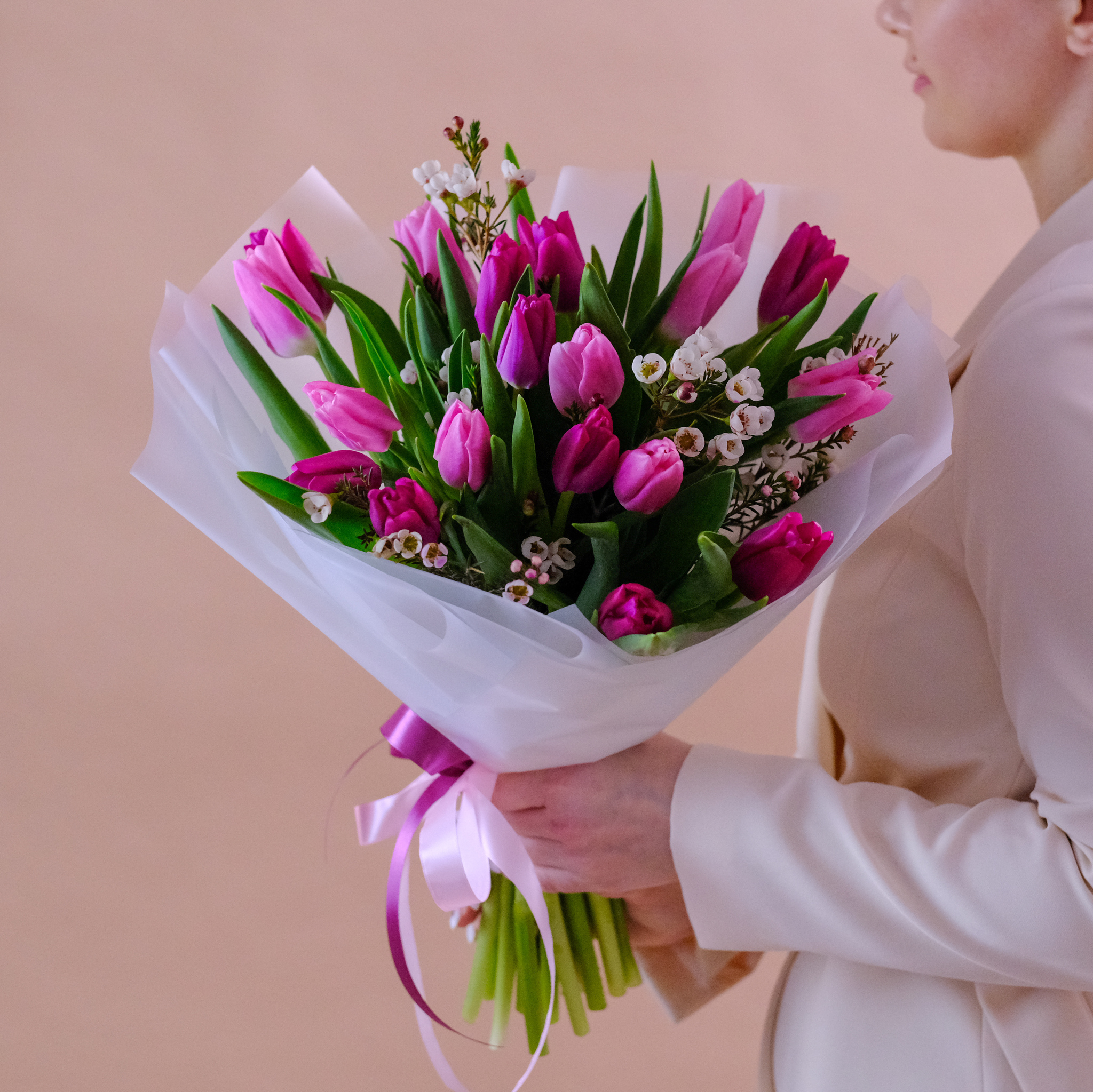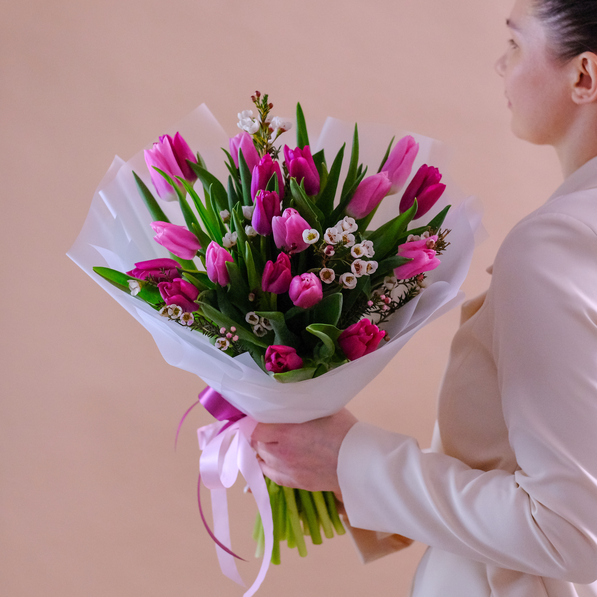 На фотографии представлен букет из 19 тюльпанов.