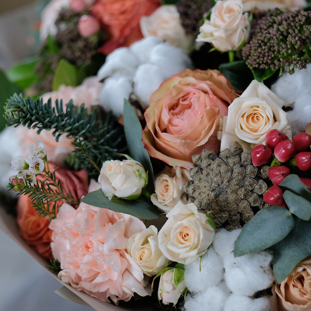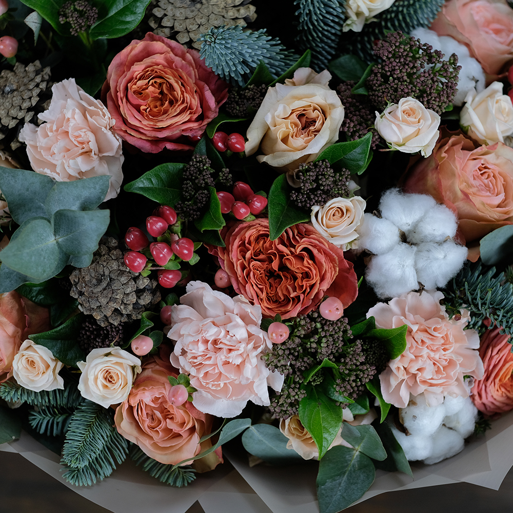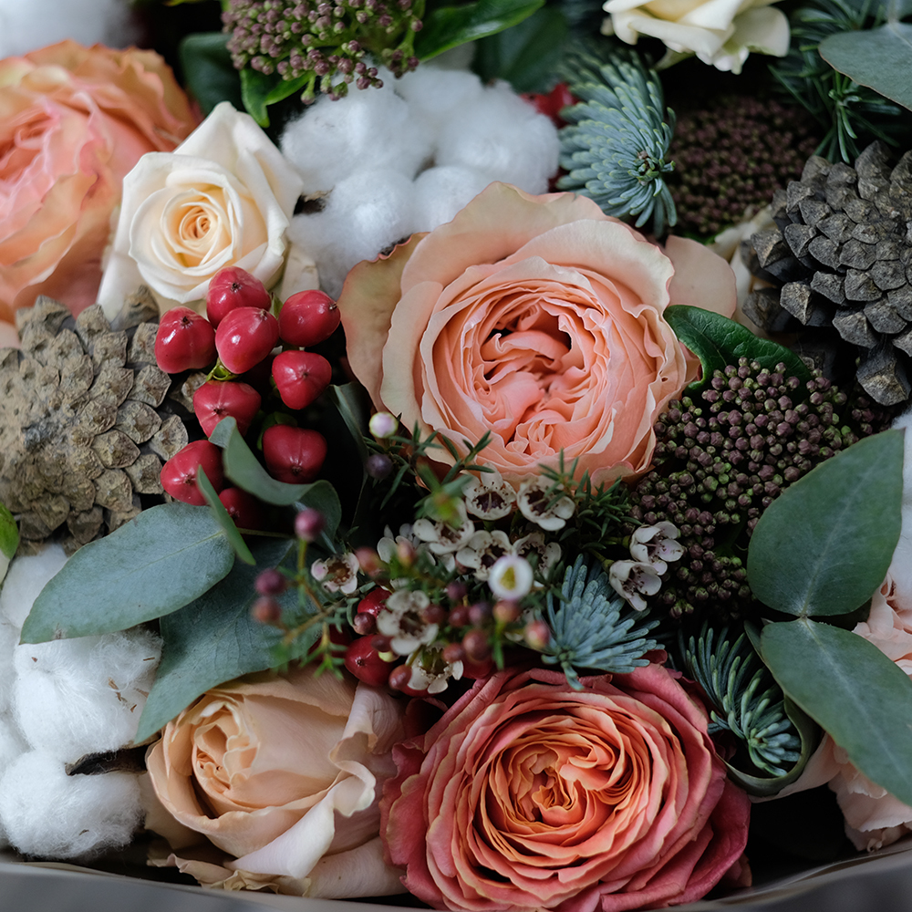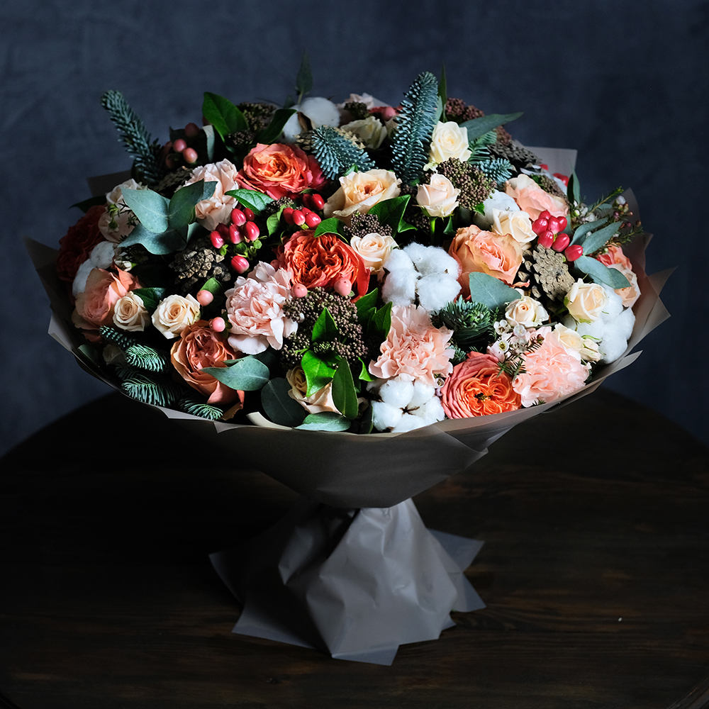 Красивый зимний букет в теплой цветовой гамме станет приятным подарком для любого человека.