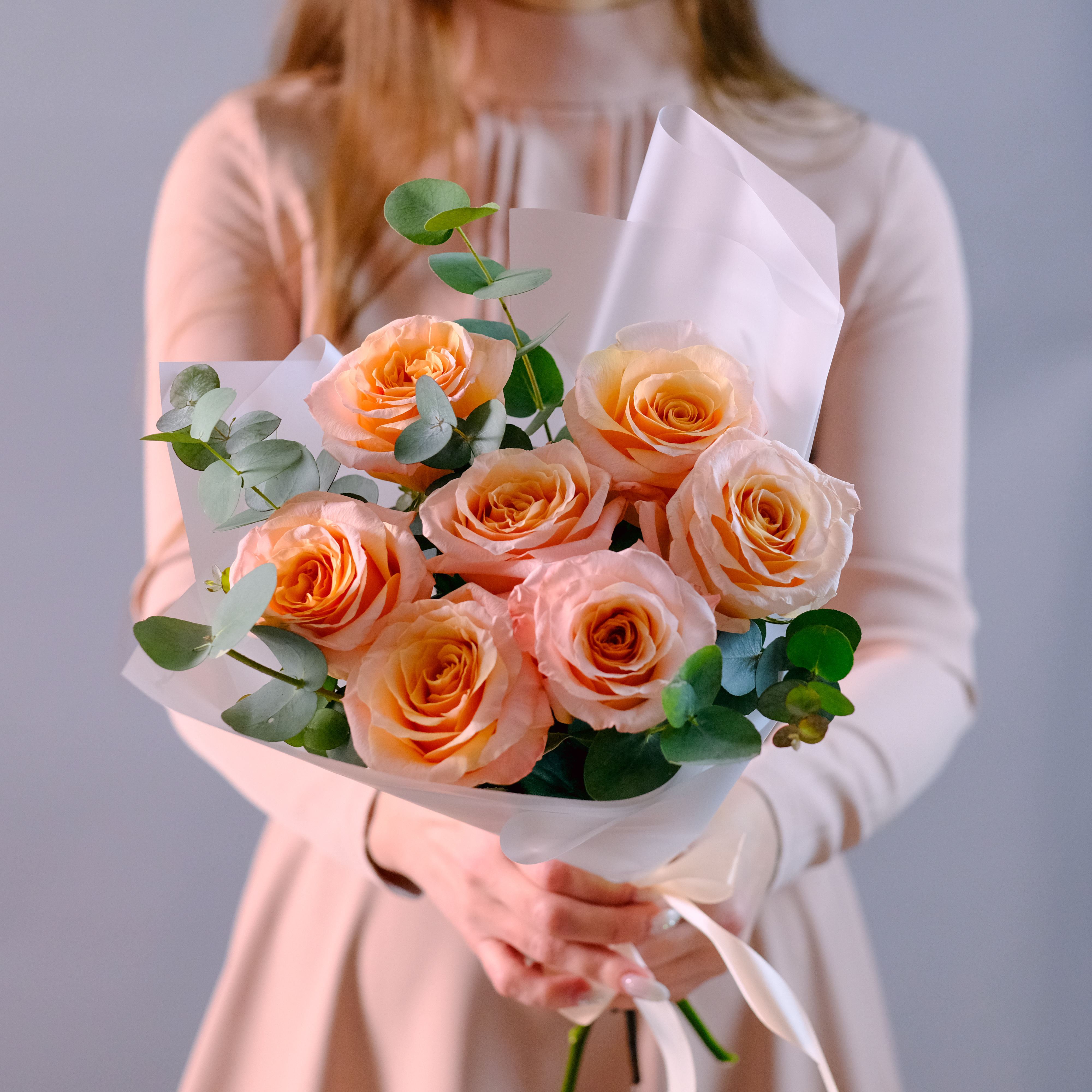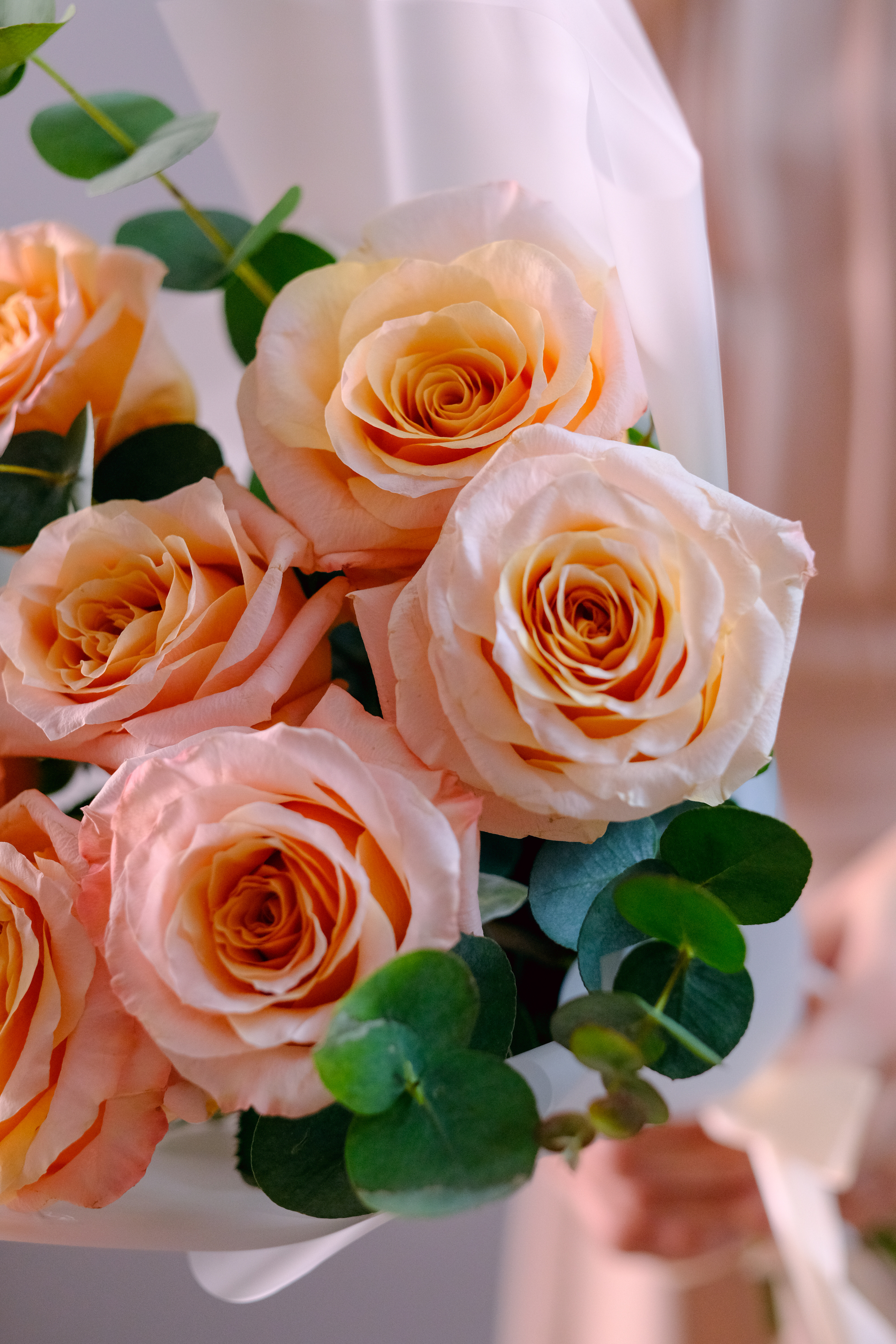 Букет пионовидных роз Shimmer Pink (Шиммер, Шимер) с эвкалиптом.