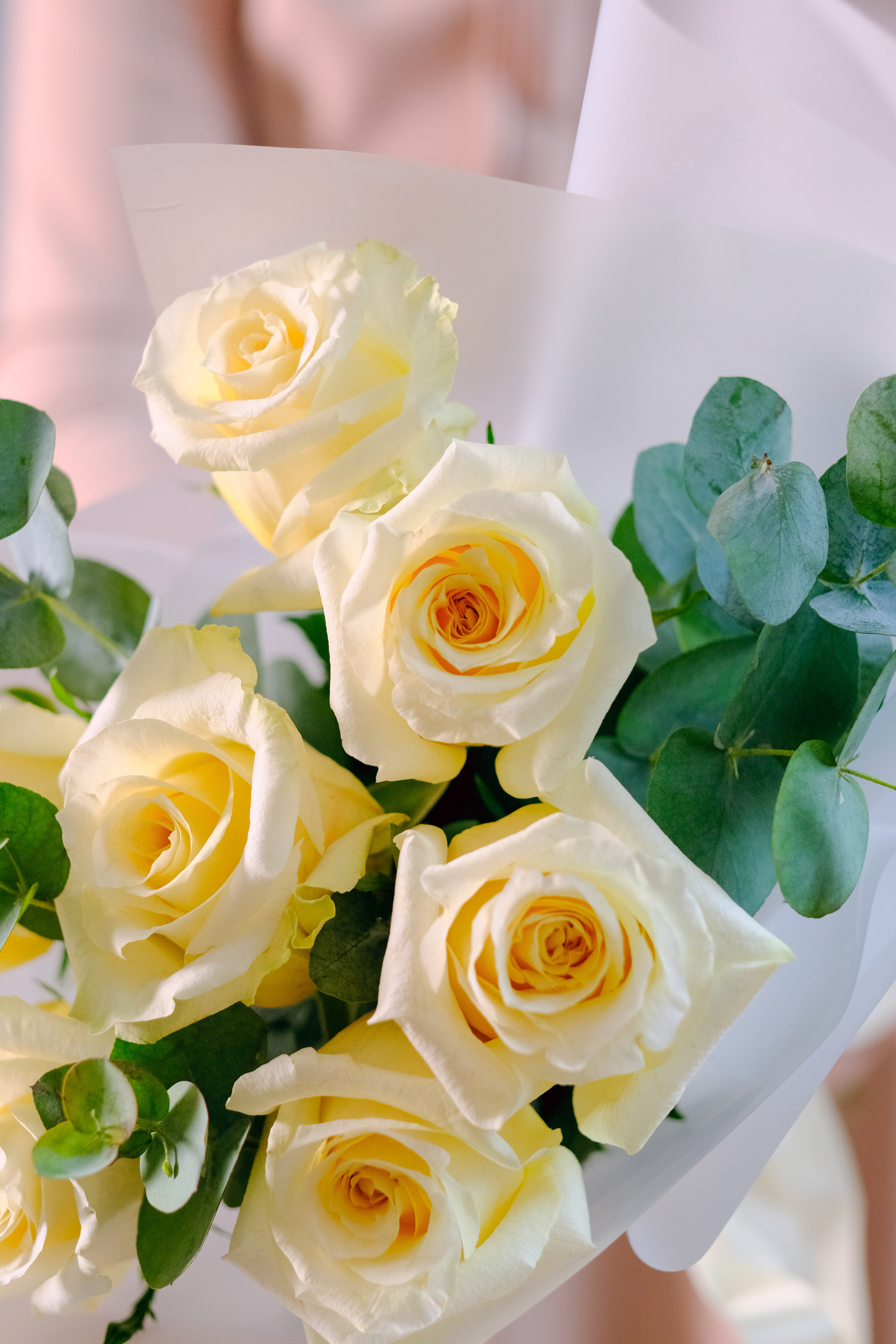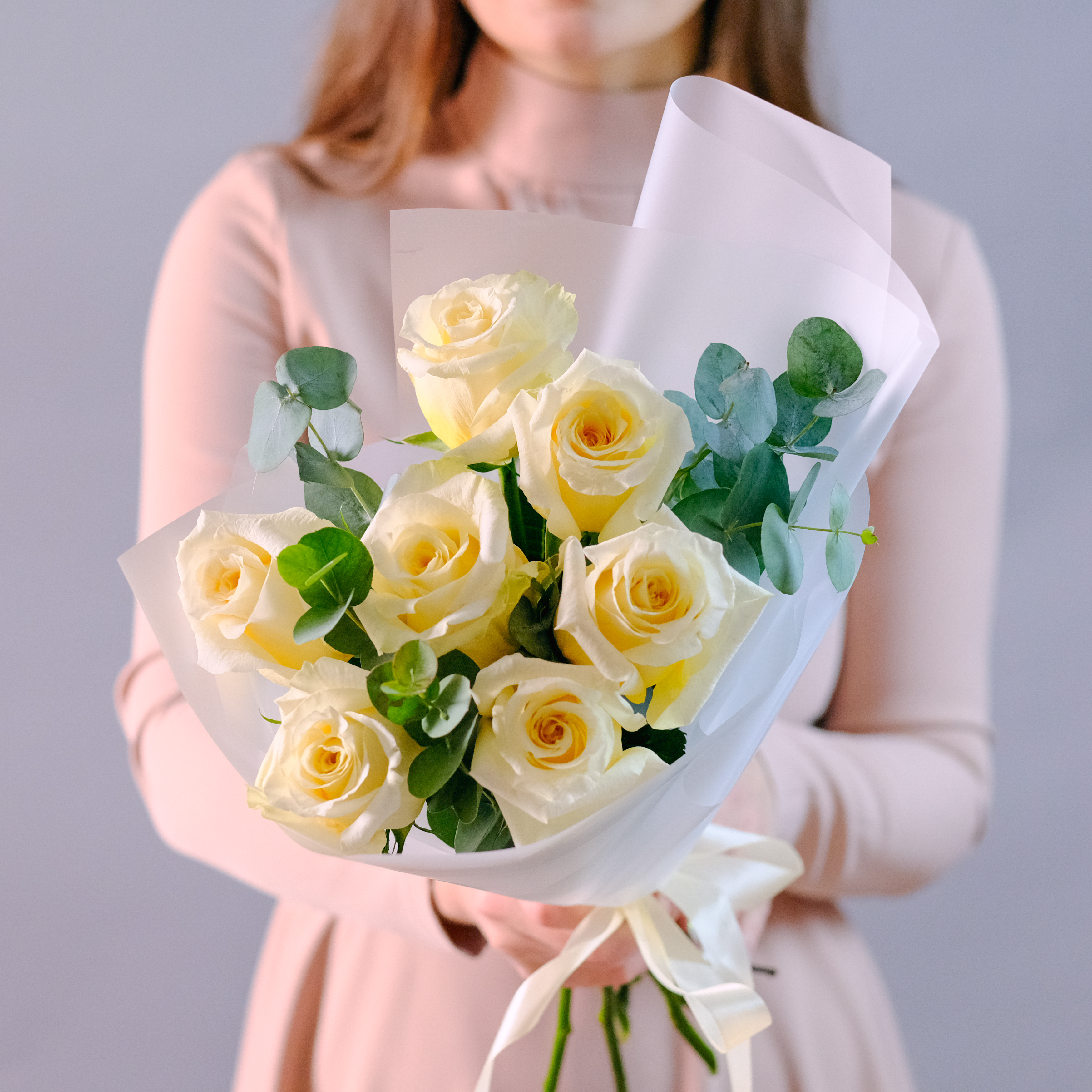 Букет пионовидных роз Candlelight (Кенделайт, Кэнделайт), Cream Shimmer (Крем Шиммер, Шимер) с эвкалиптом