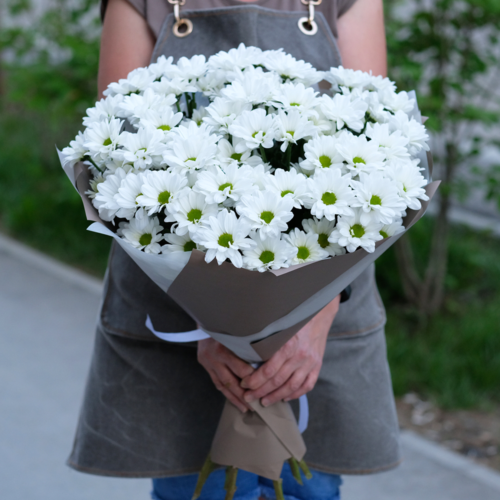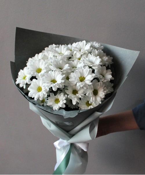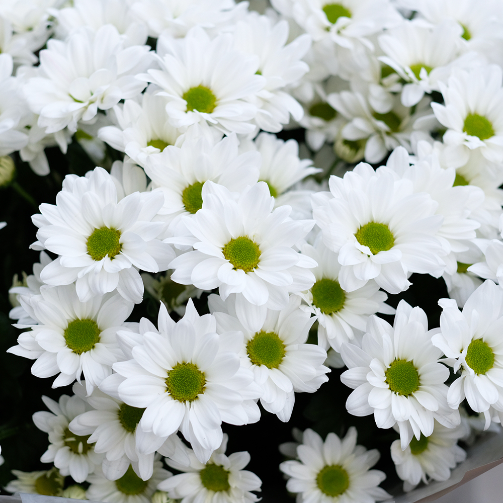 Хризантема кустовая ромашковая: небольшая сердцевина (зеленая/желтая), белые продолговатые лепестки (в один или несколько рядов).