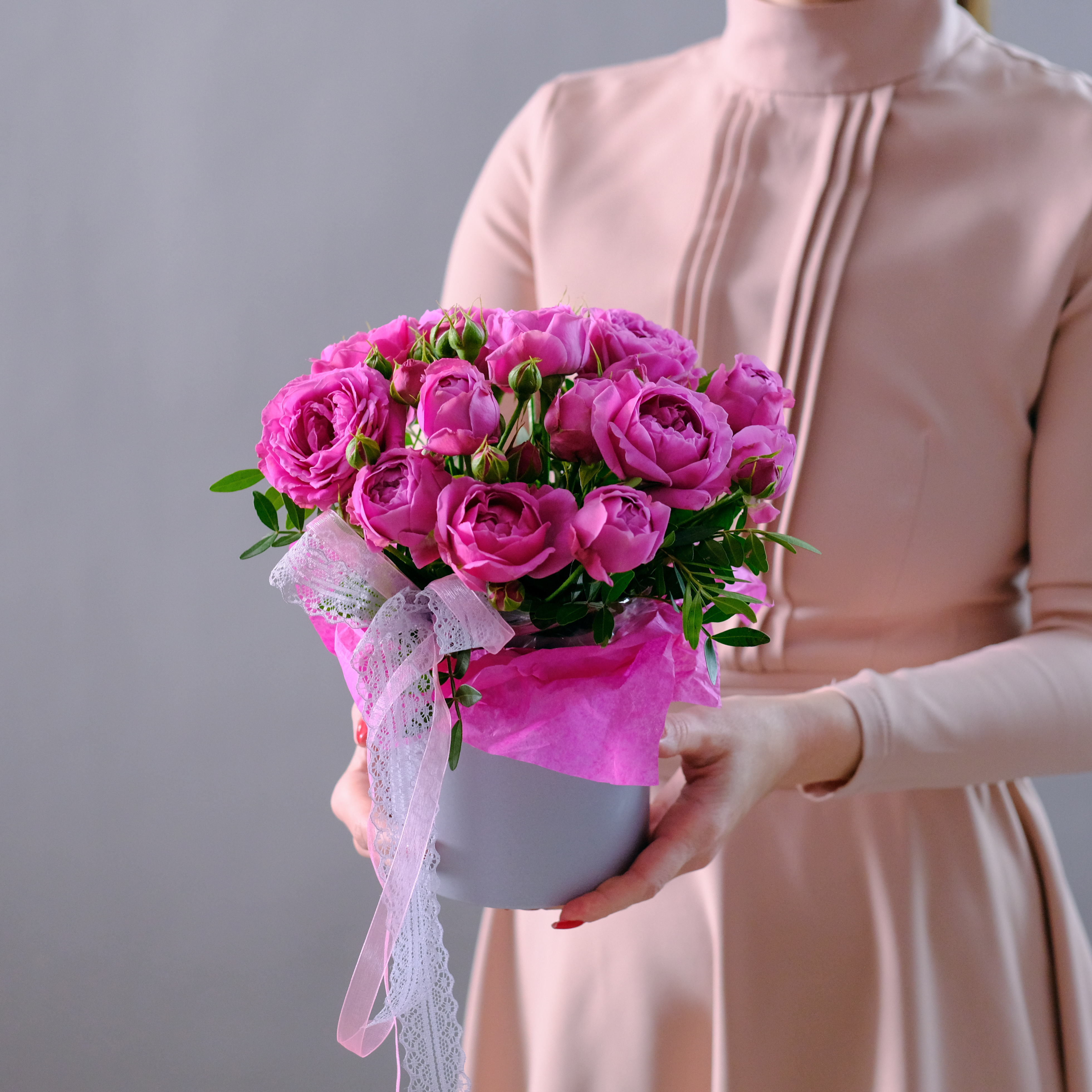 Композиция из пионовидных роз Misty Bubbles M в шляпной коробке