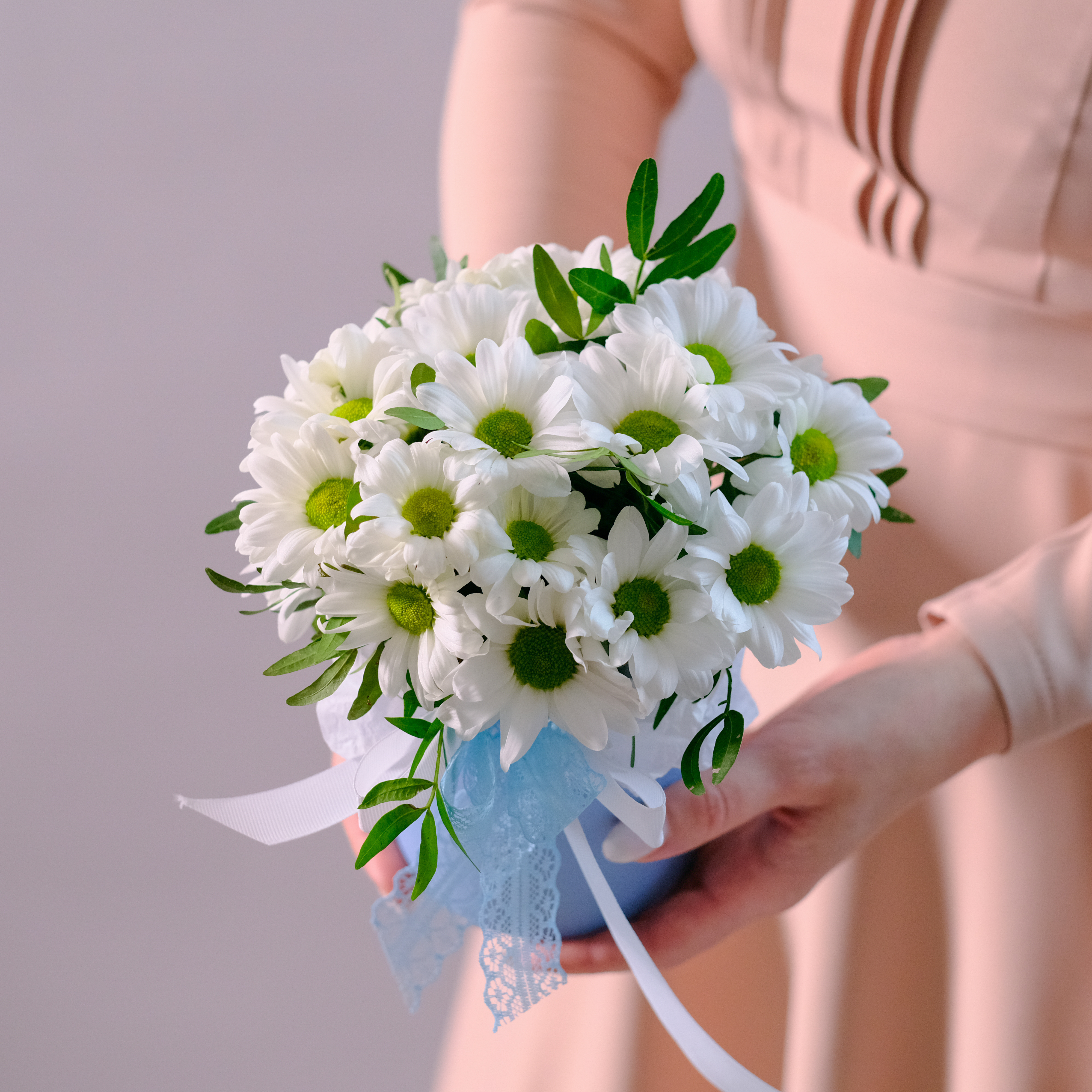 Нежность ромашек и голубой небесный цвет - всё, что нужно, чтобы передать ваши самые добрые и искренние чувства.