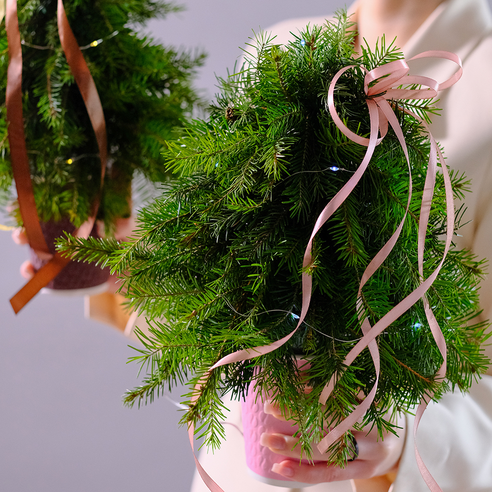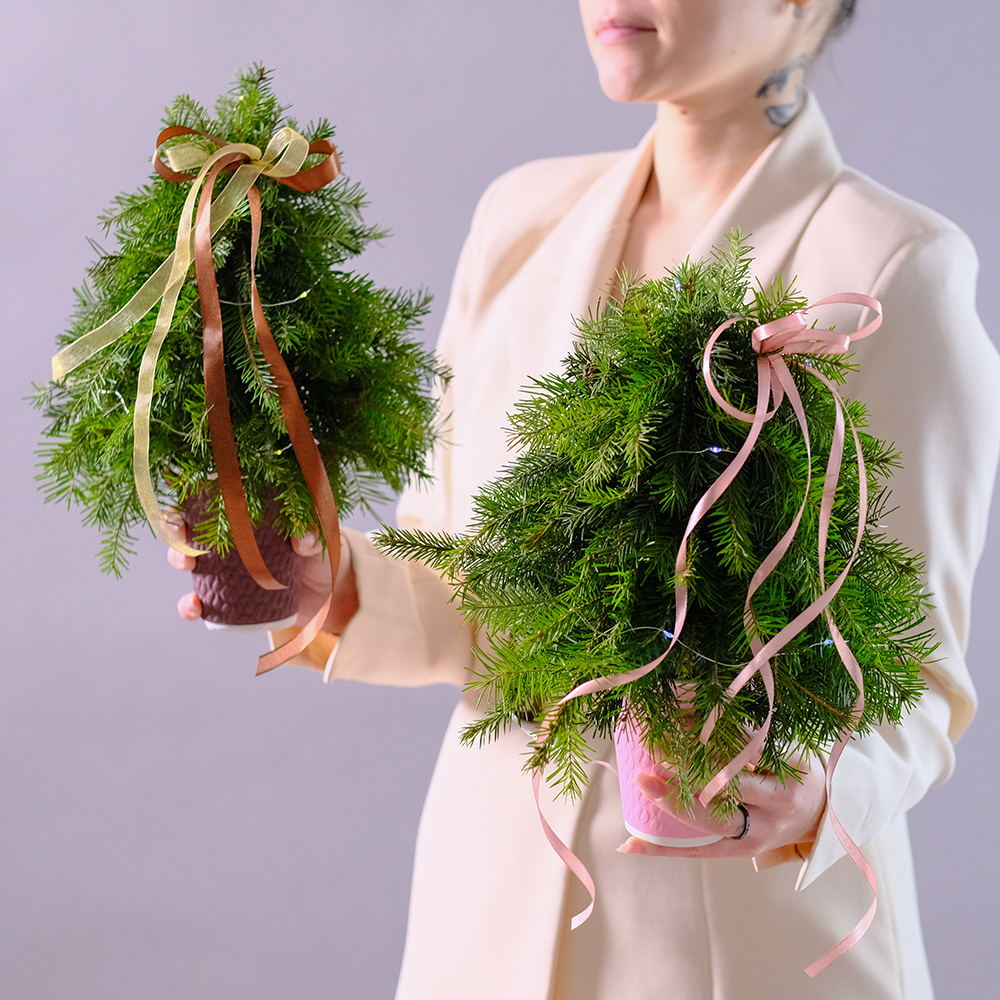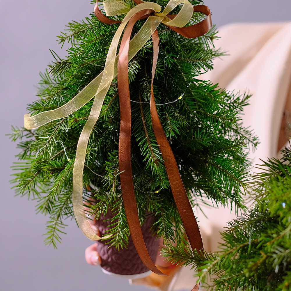 Новогодняя композиция настольная в кофейном стаканчике с еловыми ветками, декором и гирляндой.