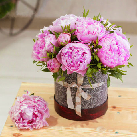 Купить небольшой букет розовые пионы в шляпной коробке в Перми