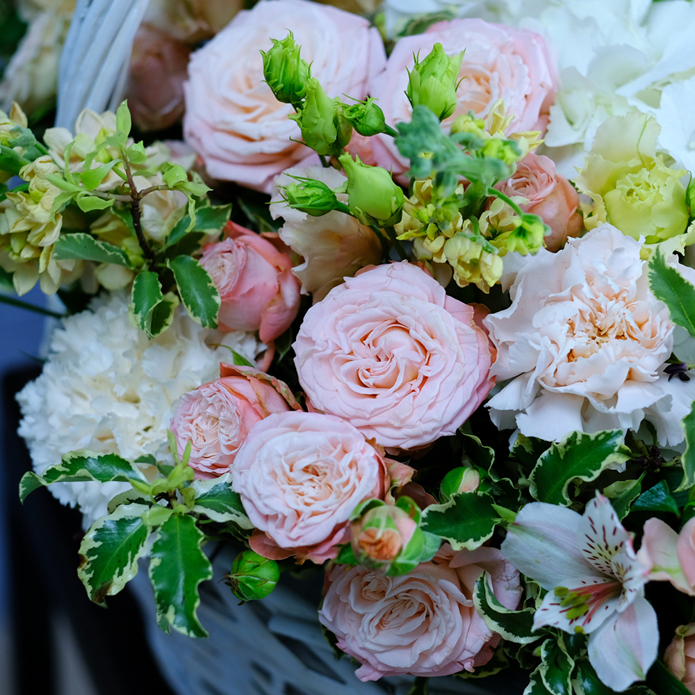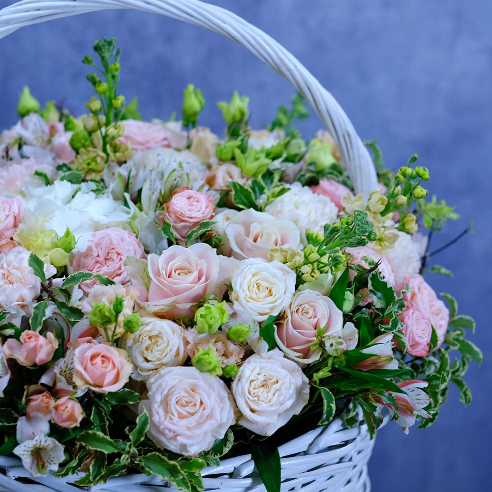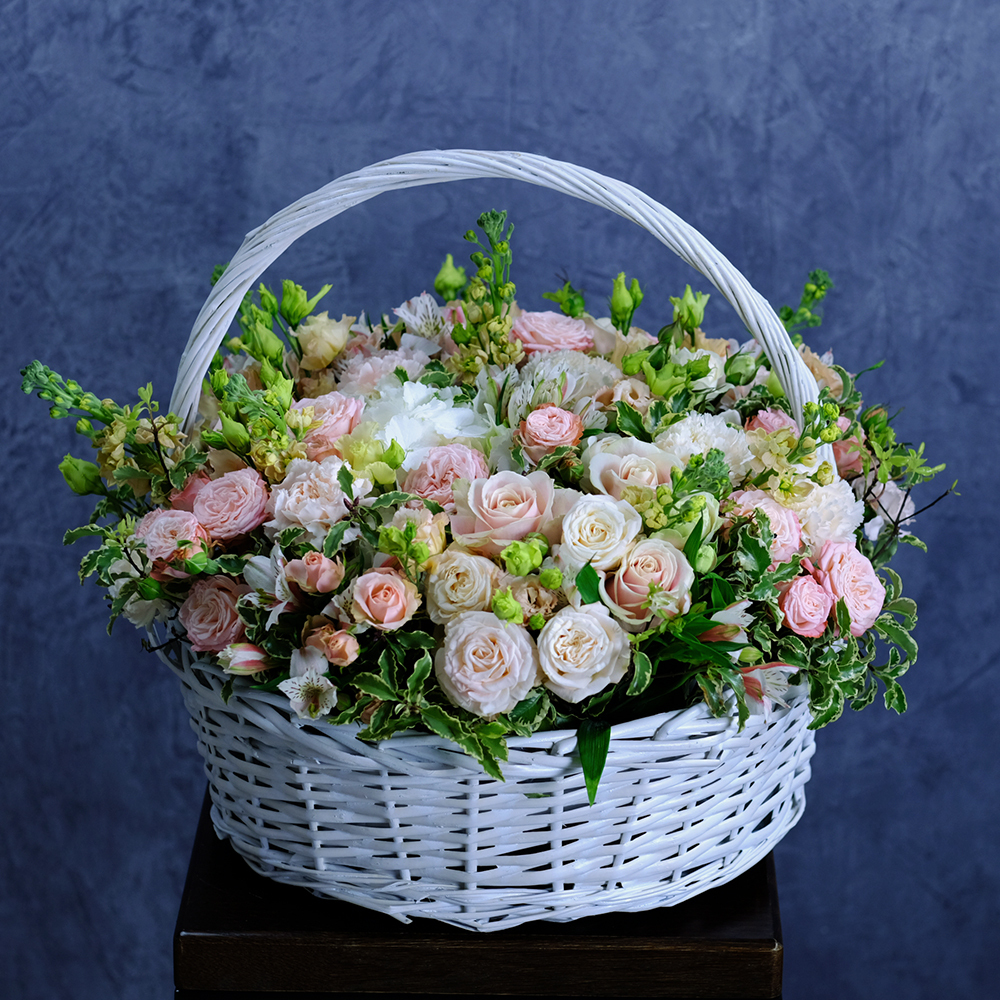 Корзина «Мимолетный каприз» с гортензией и пионовидными розами