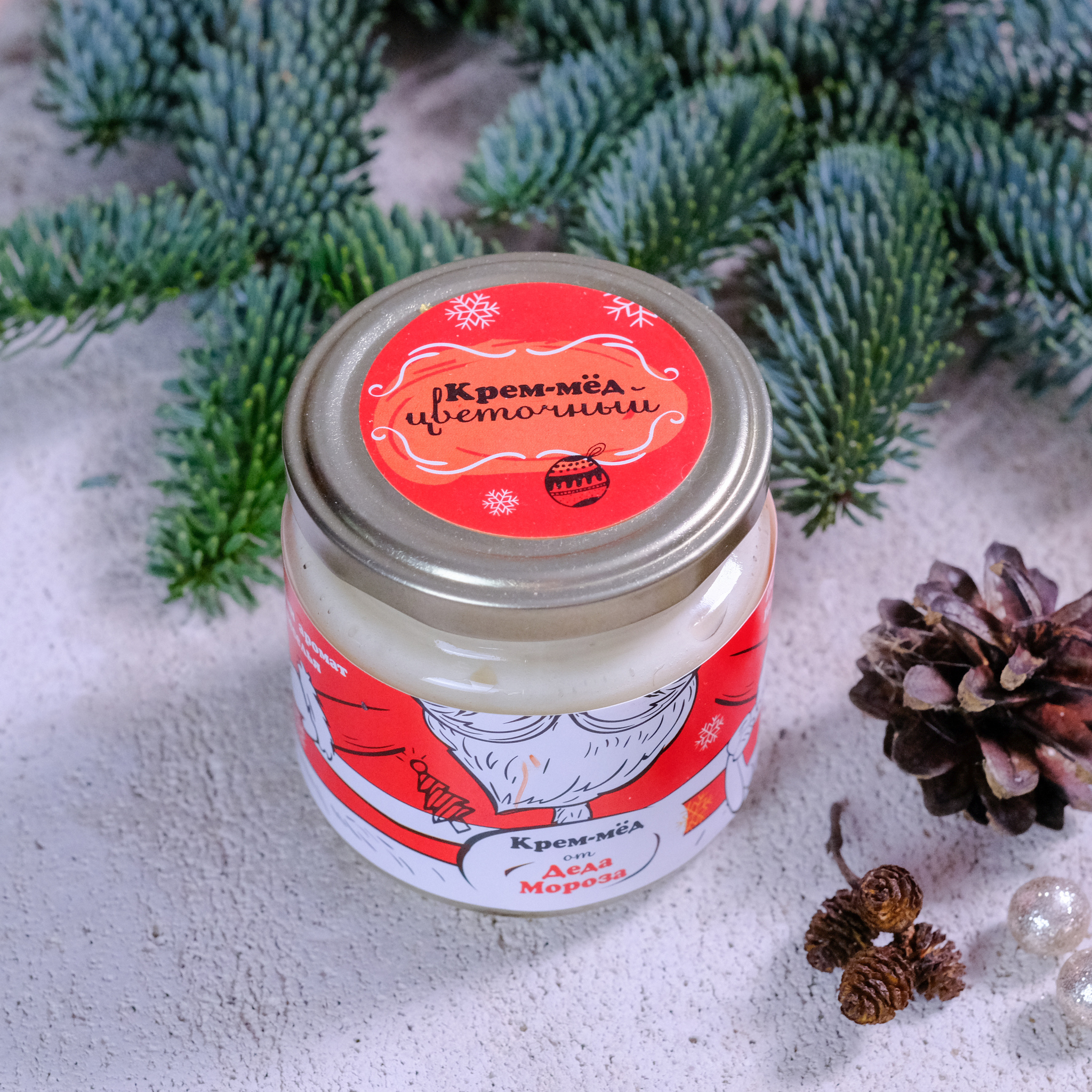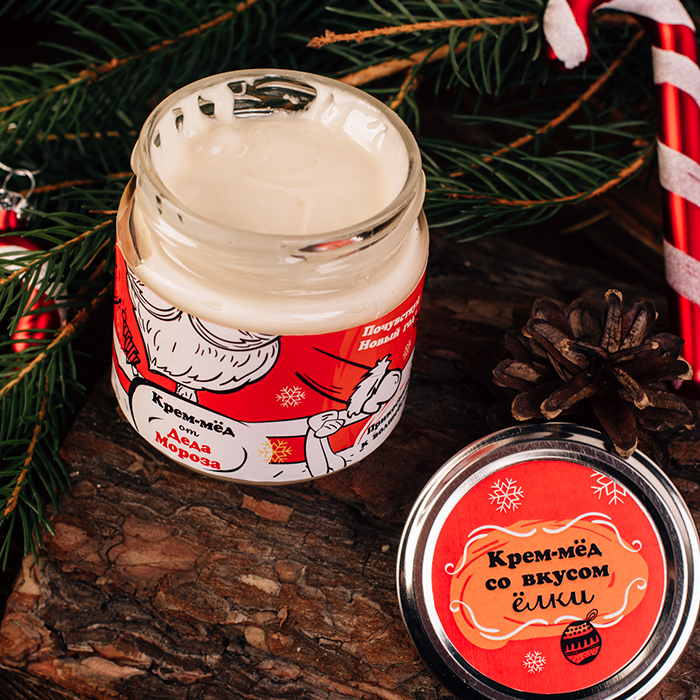 Дед Мороз очень любит сладкое и новогоднюю ёлку. Этот крем-мёд сочетает в себе и то и другое. Он с живицей, которая придаёт взбитому мёду лёгкий привкус смолы.