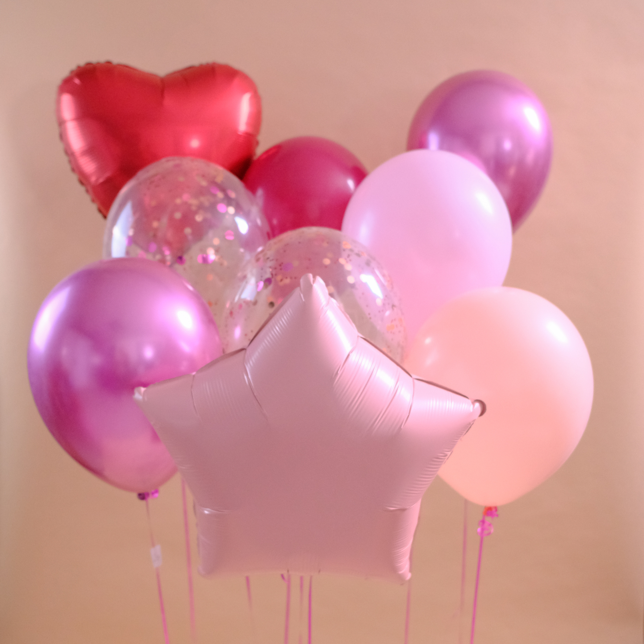 Цвет - розовый, красный. Оттенки и рисунки на шарах могут отличаться от фотографии.