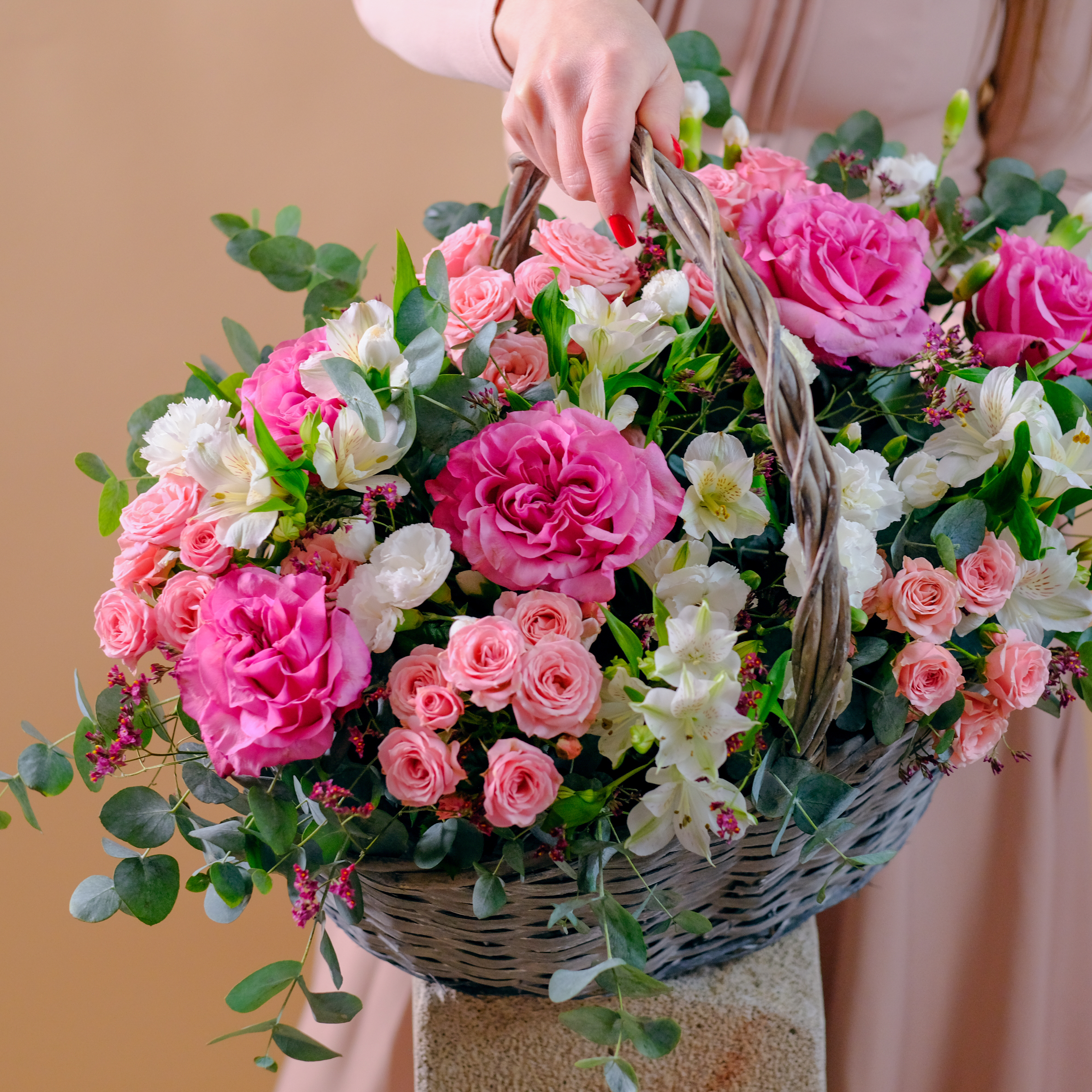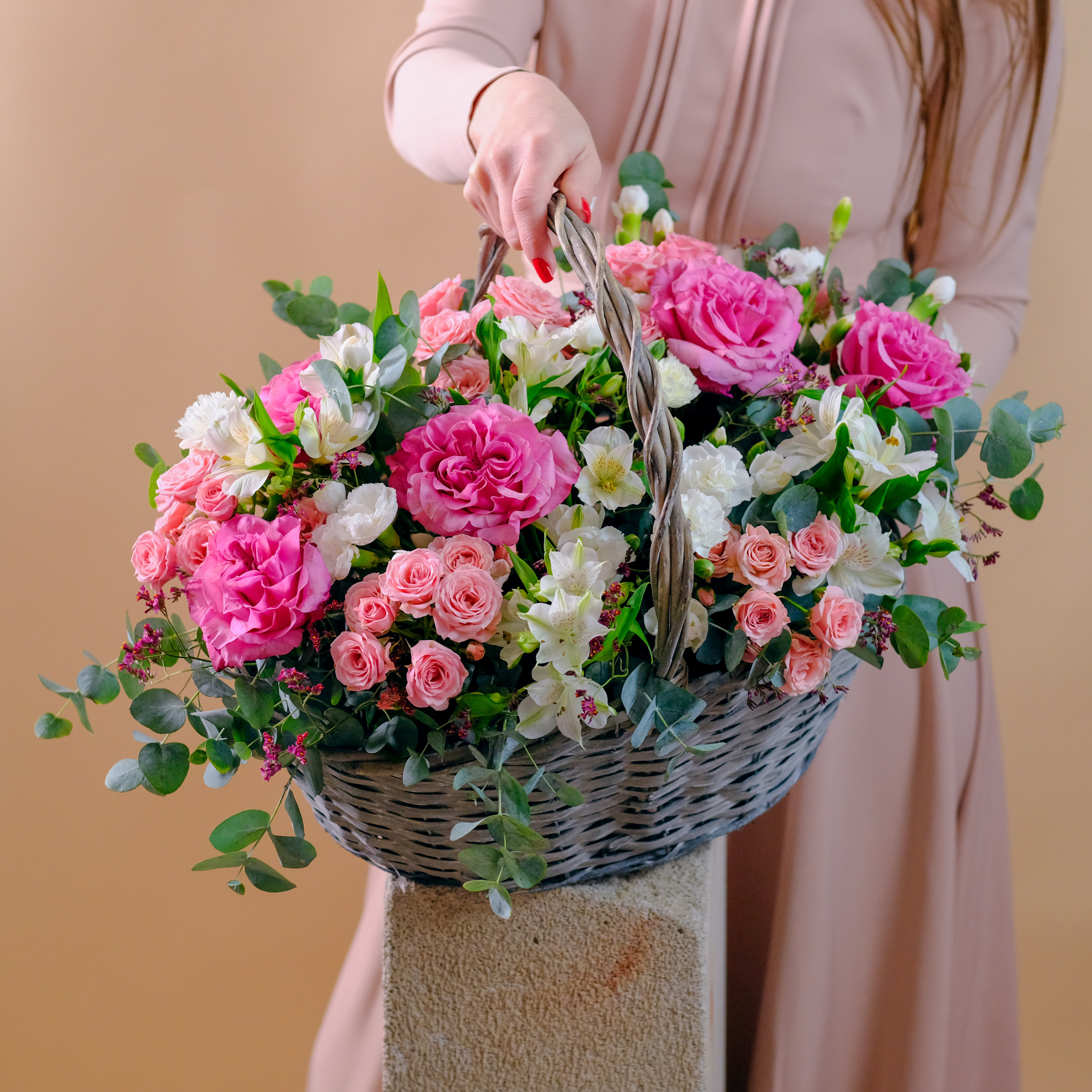 Нежная композиция с пионовидными розами в плетенной корзине #242