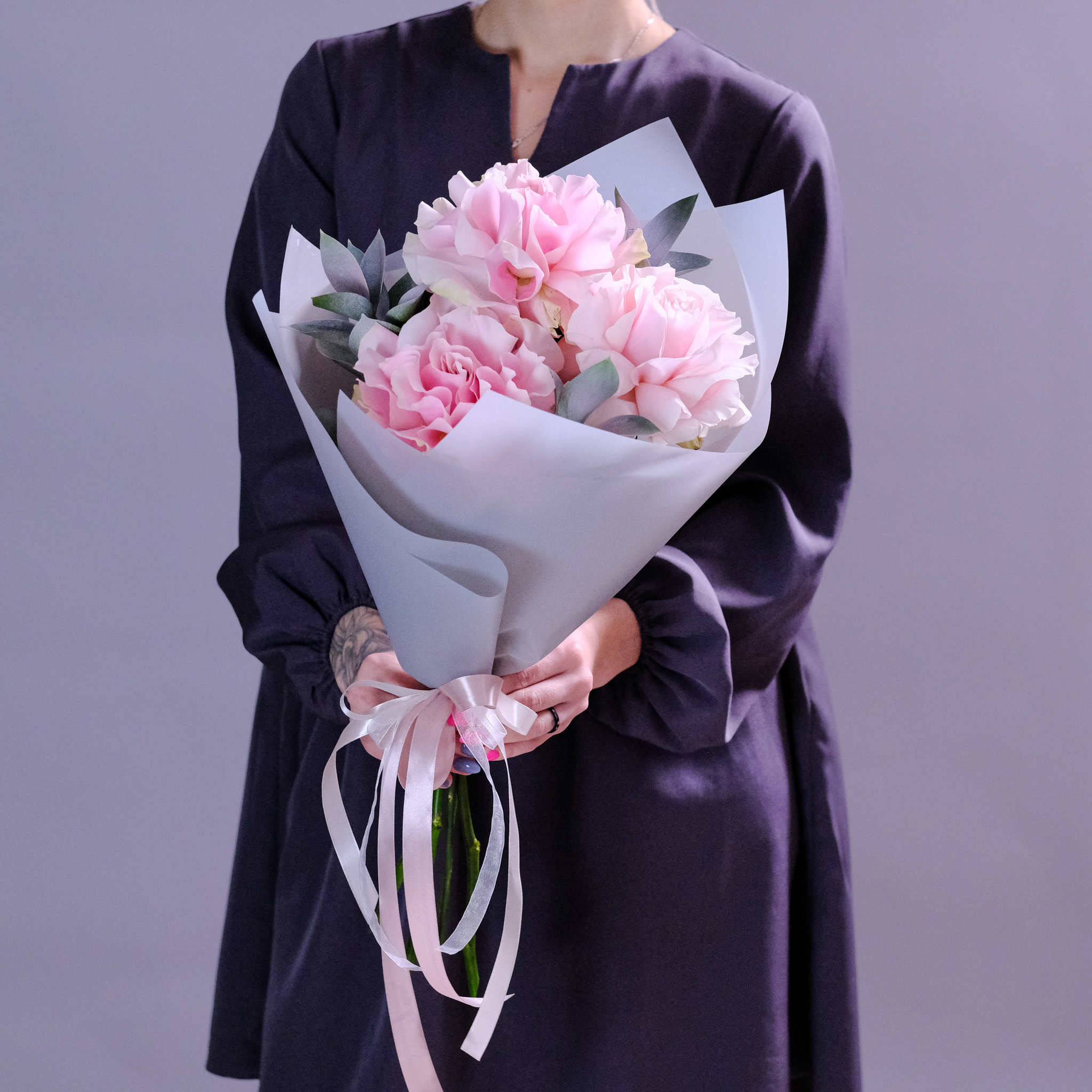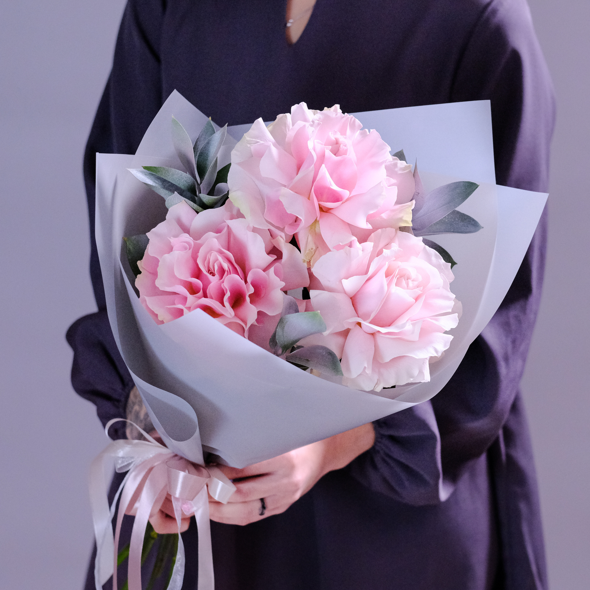 Французские розы нежно-розового цвета станут приятным подарком для близкого человека. Огромный размер бутона позволяет сделать даже из трех роз презентабельный букет.