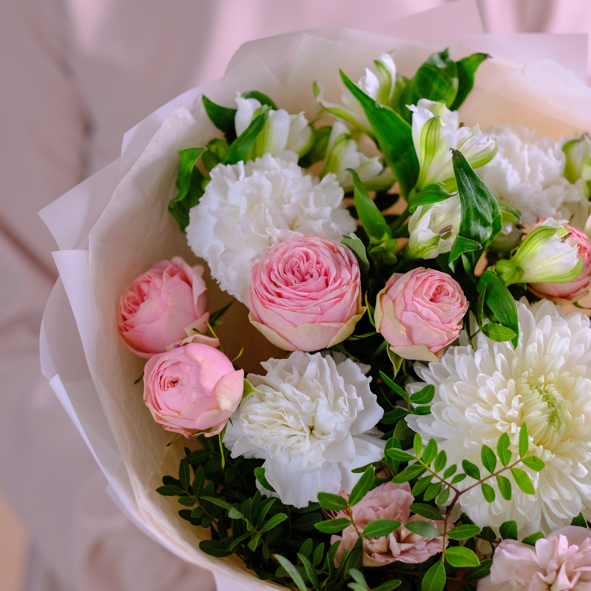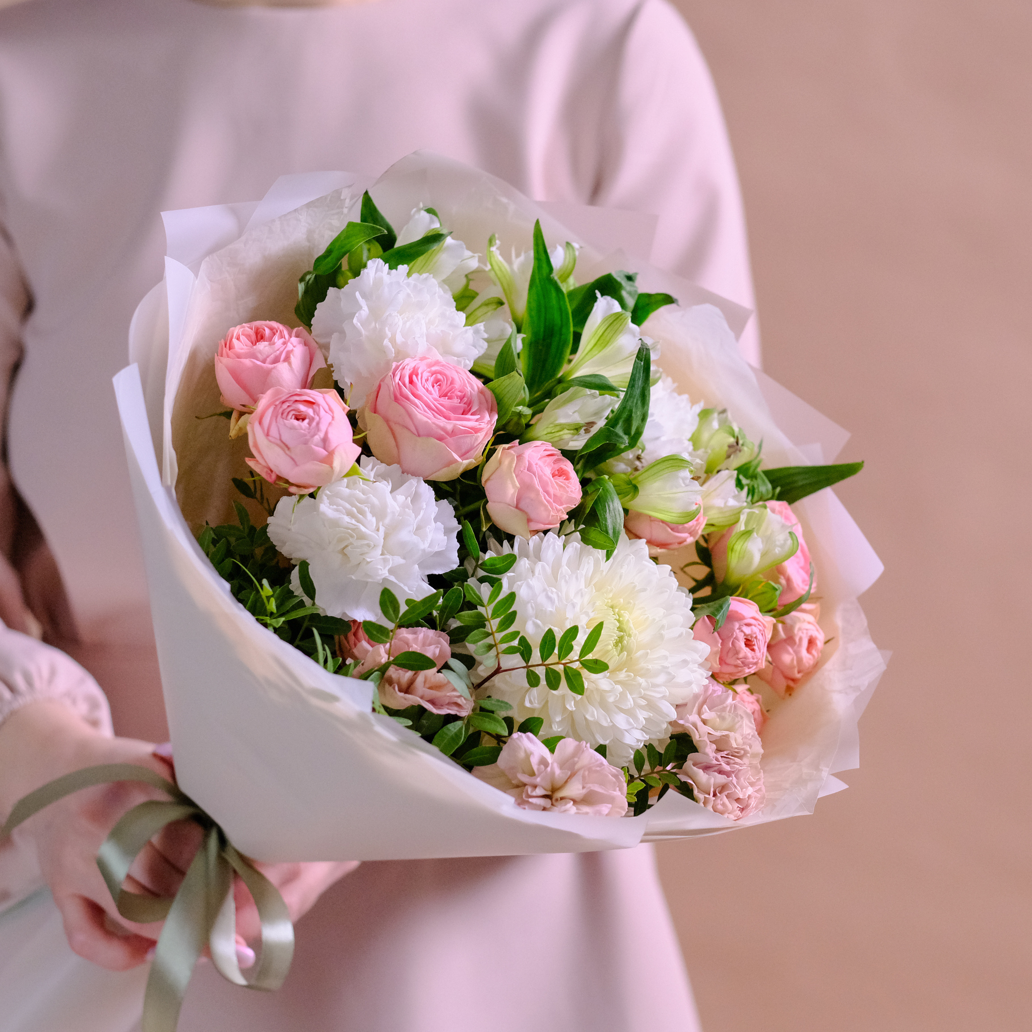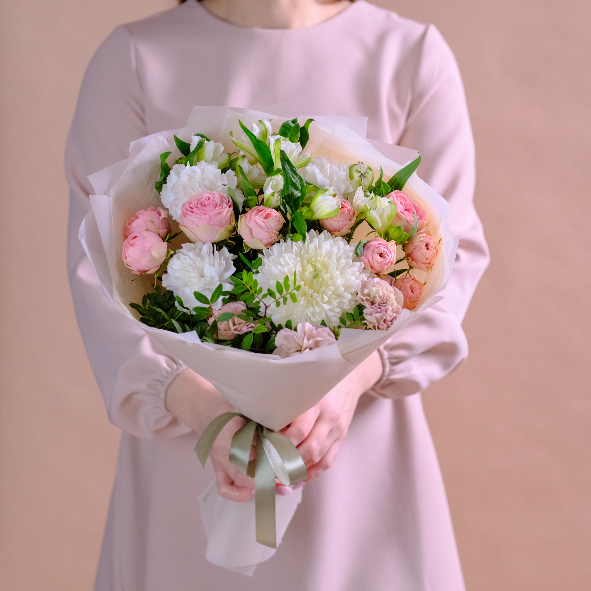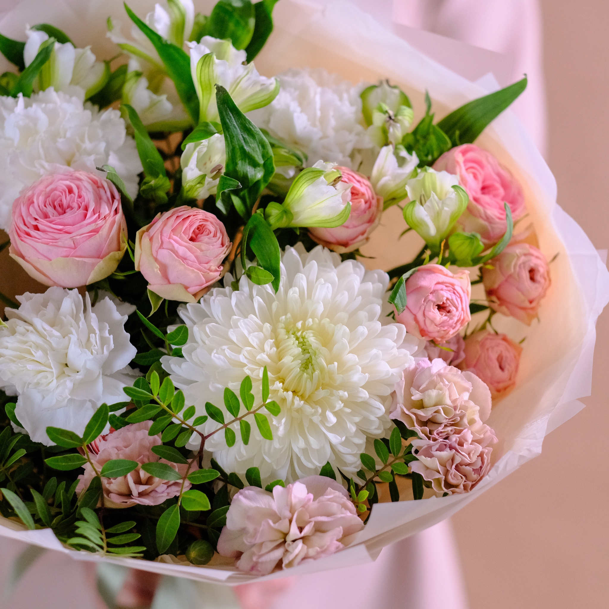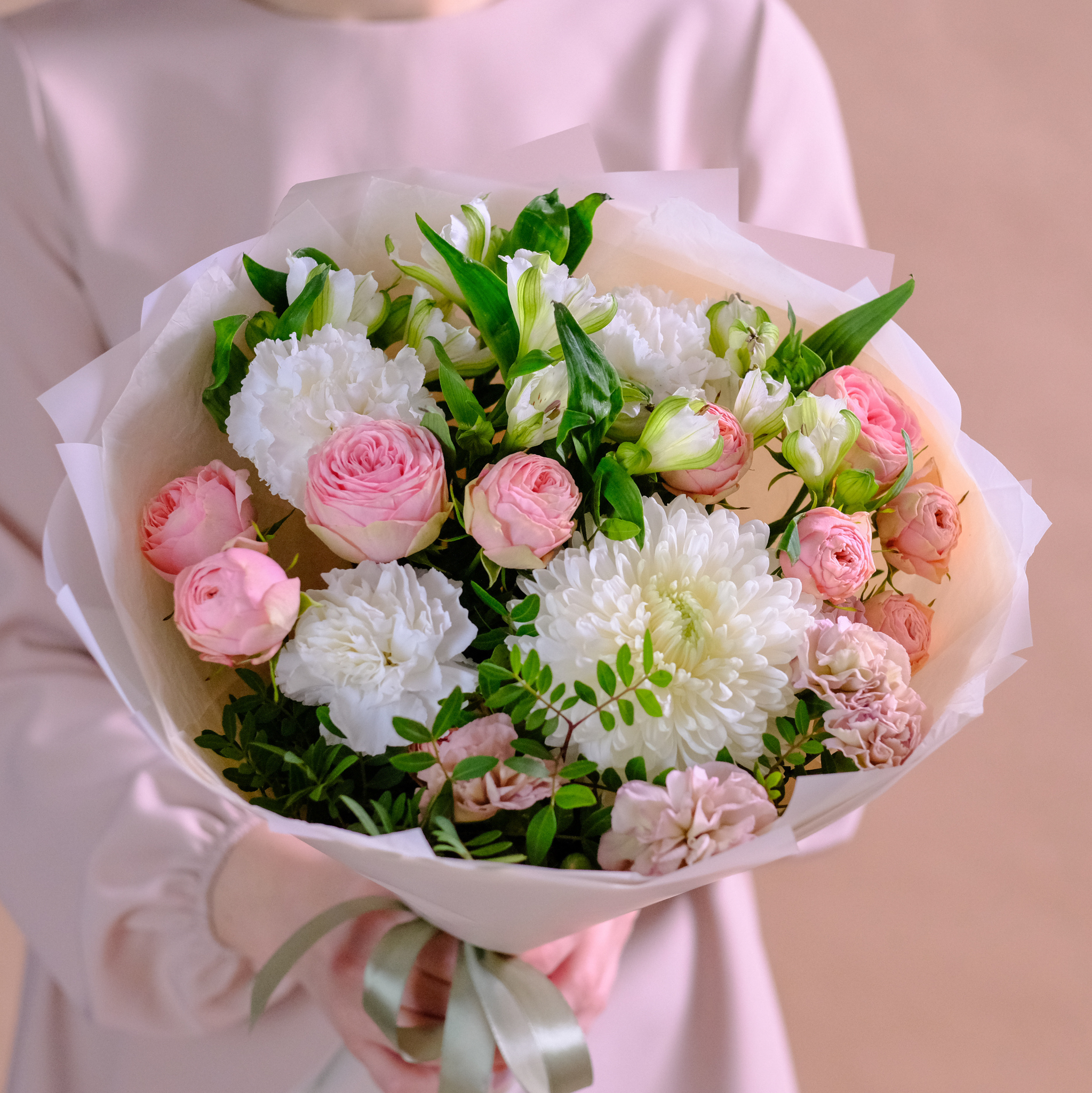 Нежный букет с премиум хризантемой и пионовидными розами #144