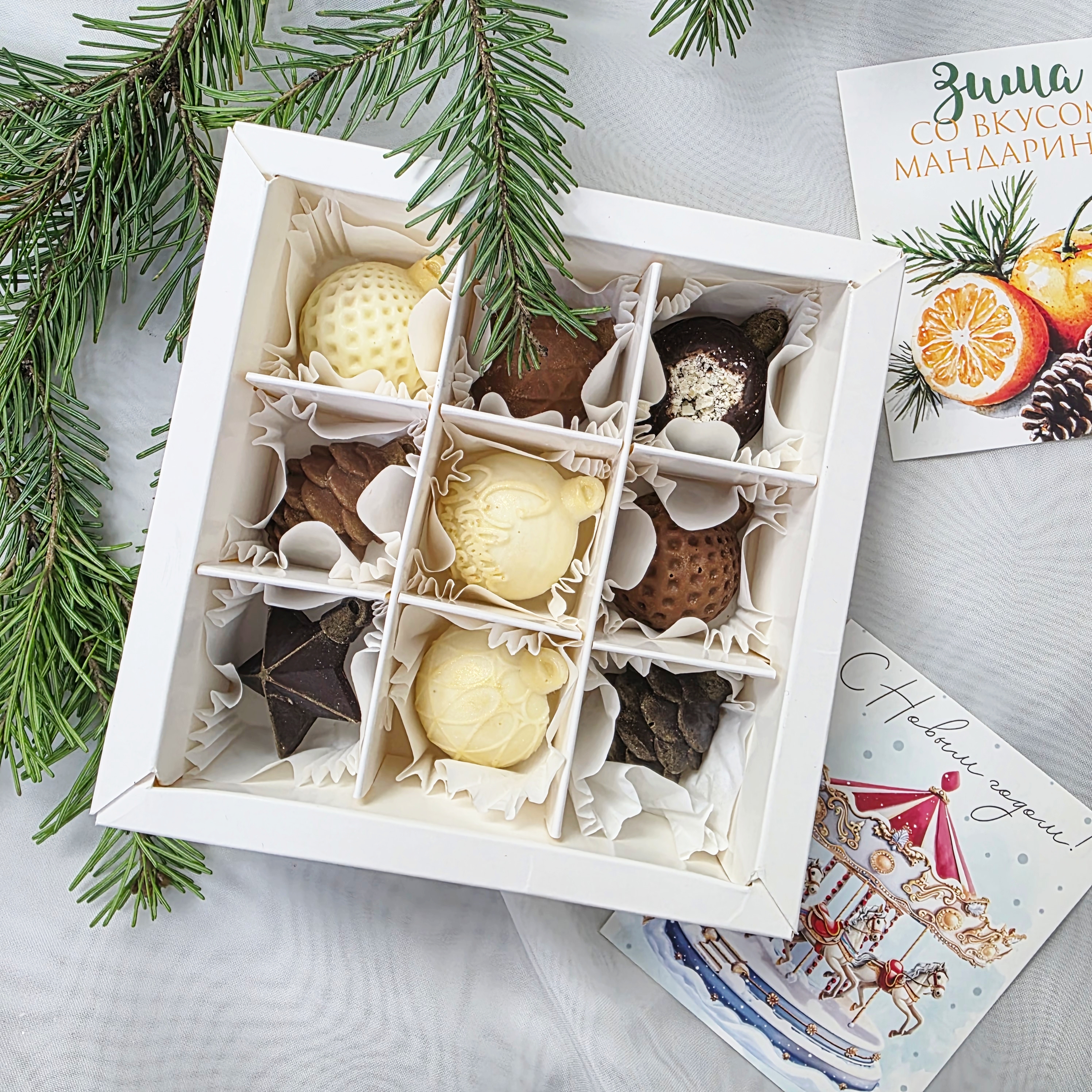 Ассорти молочного, белого и тёмного шоколада без добавок. Молочный шоколад с фундуком, тёмный с миндалём, белый с кешью. В каждой коробочке по 3 конфеты из каждого вида шоколада, распределение рандомное.