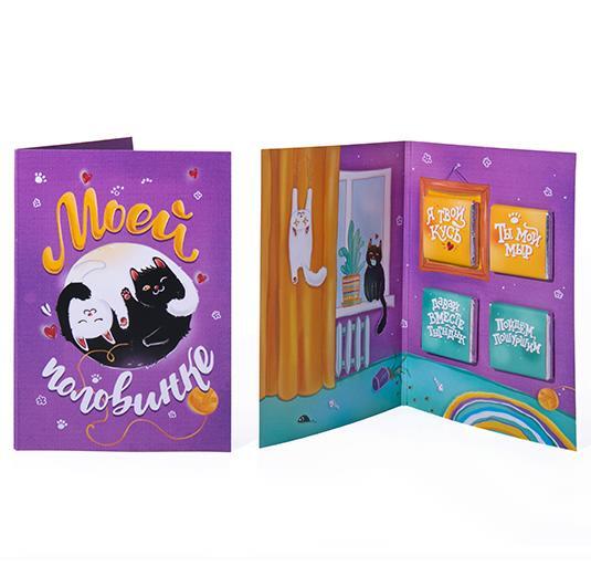 В открытке 4 шоколадки по 5 граммов каждая. Все конфеты завёрнуты в индивидуальные фантики с дизайном и душевными или дерзкими надписями (зависит от тематики подарка). А сама открытка герметично упакована в прозрачную плёнку (в открытом виде).