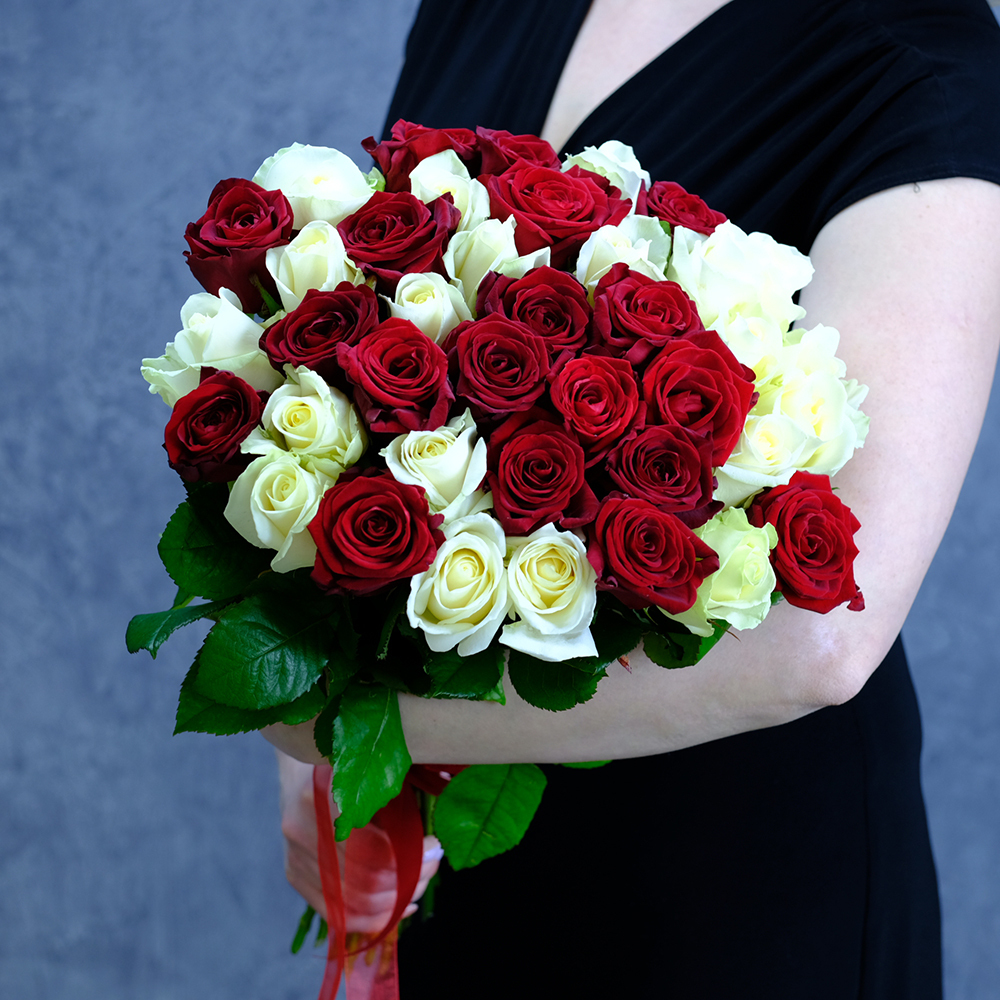 В составе букета розы красных и белых сортов.
