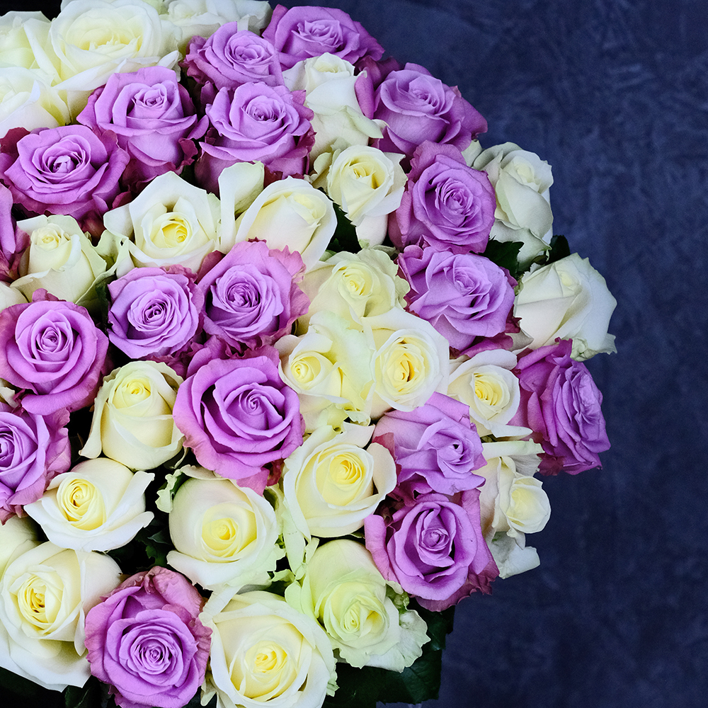 Нежное сочетание белых и сиреневых роз как искреннее пожелания от любимого или близких друзей!