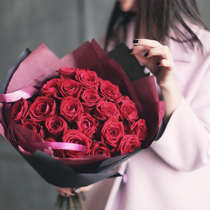 Букет из 25 роз в стильной черной упаковке.
