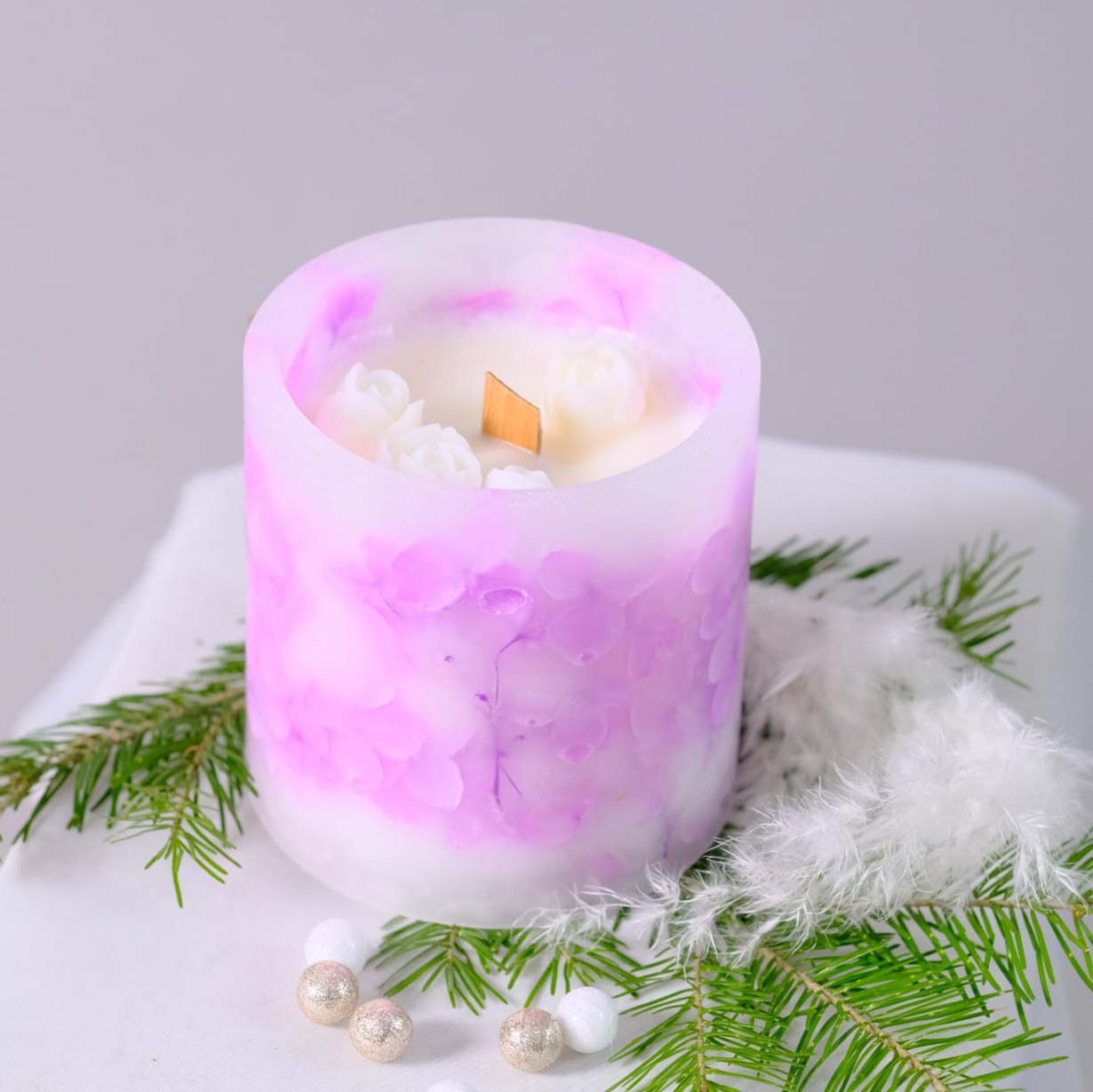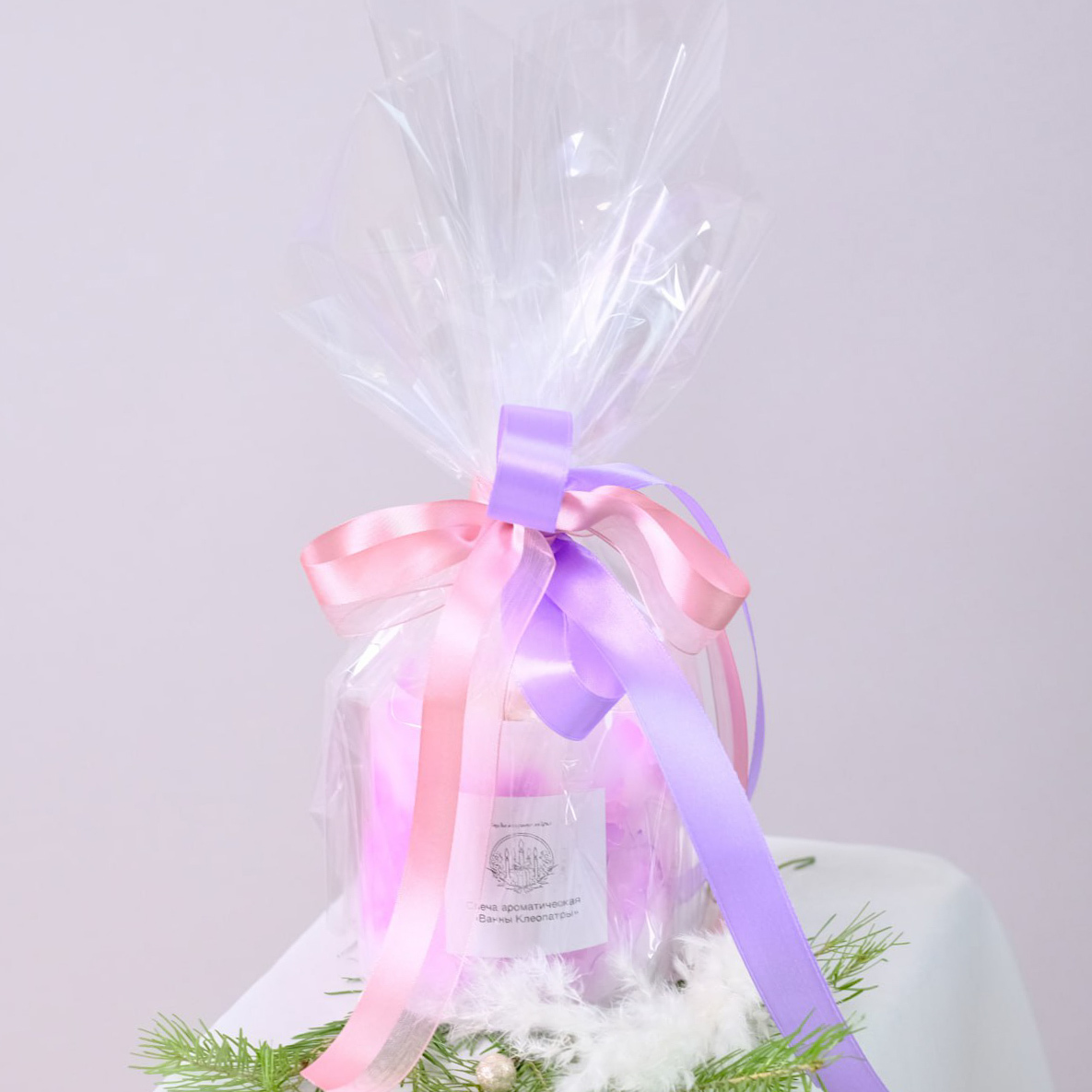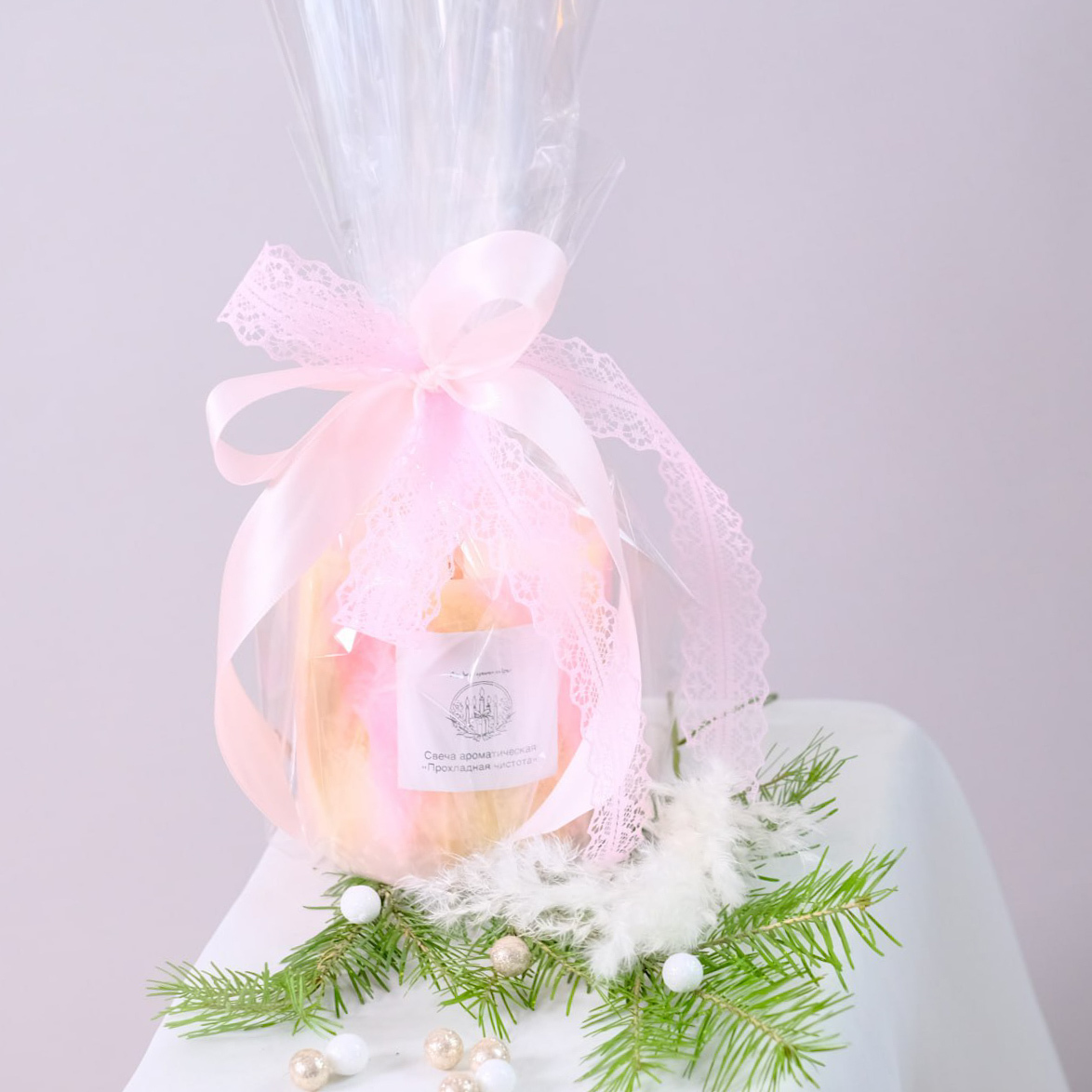 Свеча из парафина и сухоцветов, оформленная в прозрачную пленку с лентой.