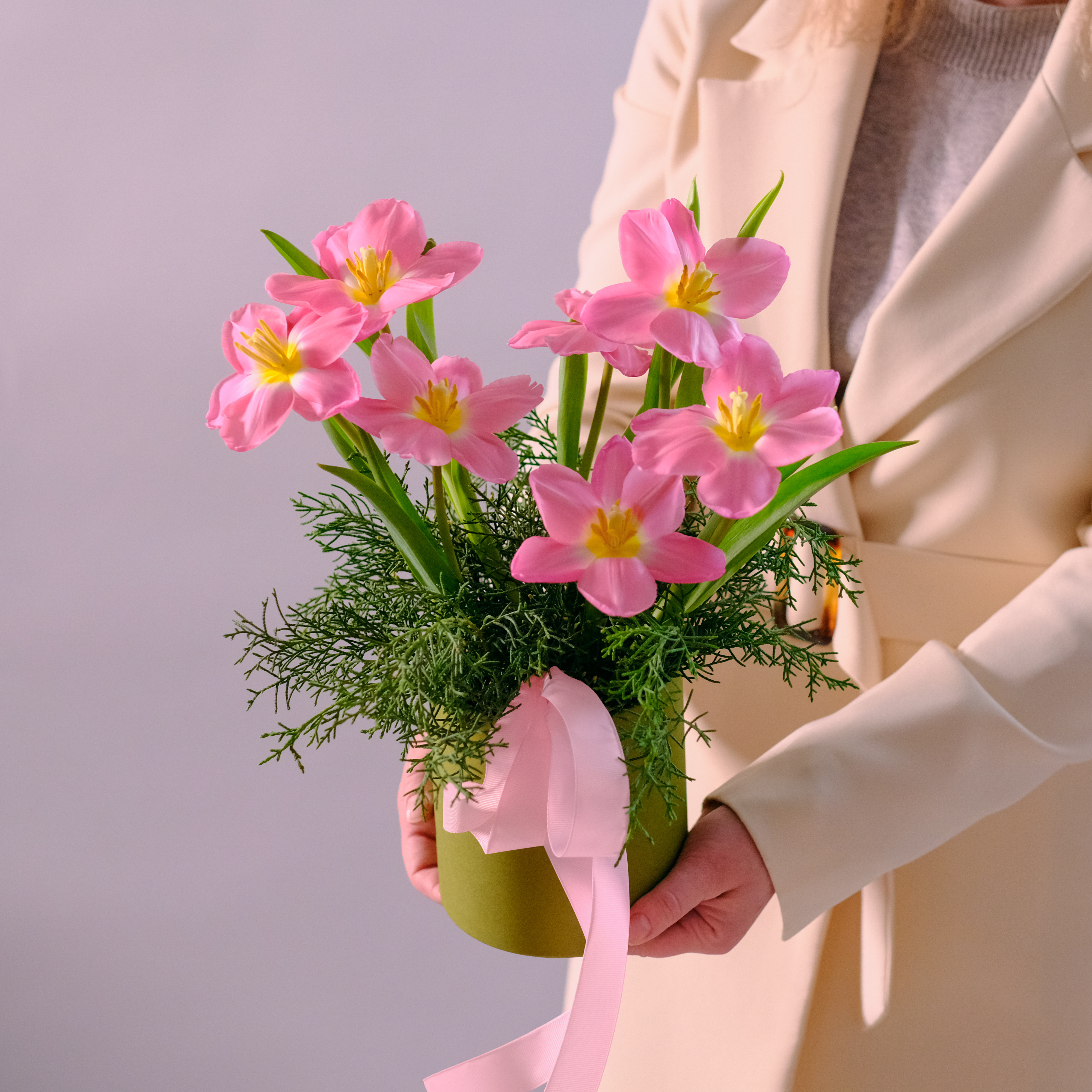 Весенняя композиция с тюльпанами в шляпной коробке #232