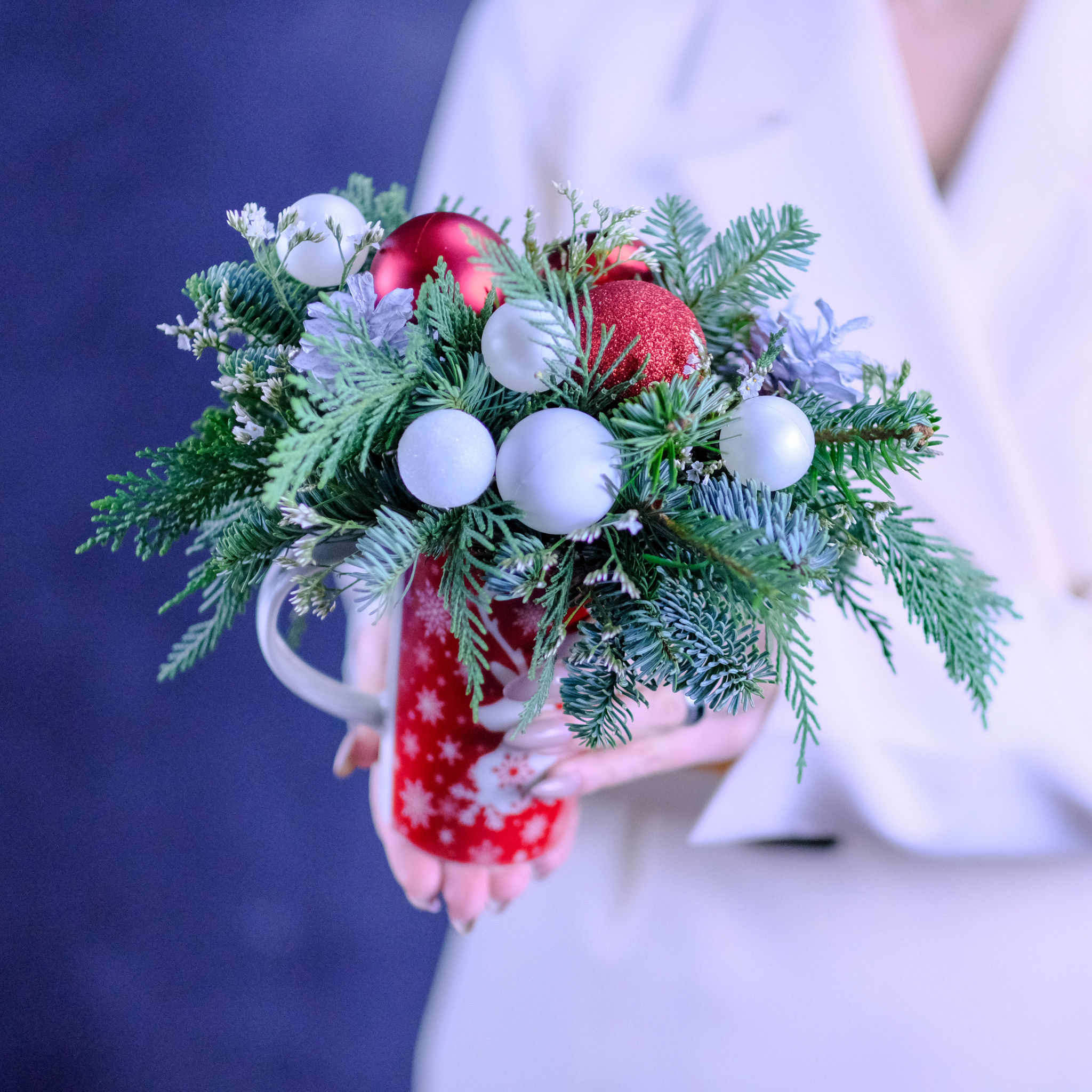Новогодняя композиция настольная в кружке с еловыми ветками и декором.
