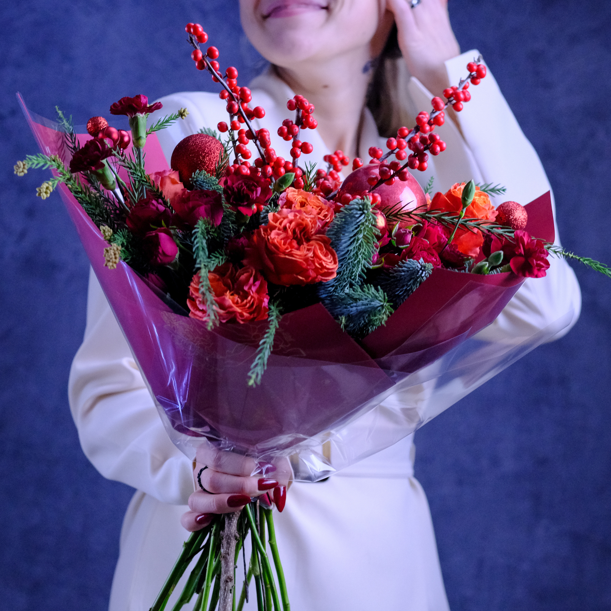 Яркий зимний букет с садовыми розами #710