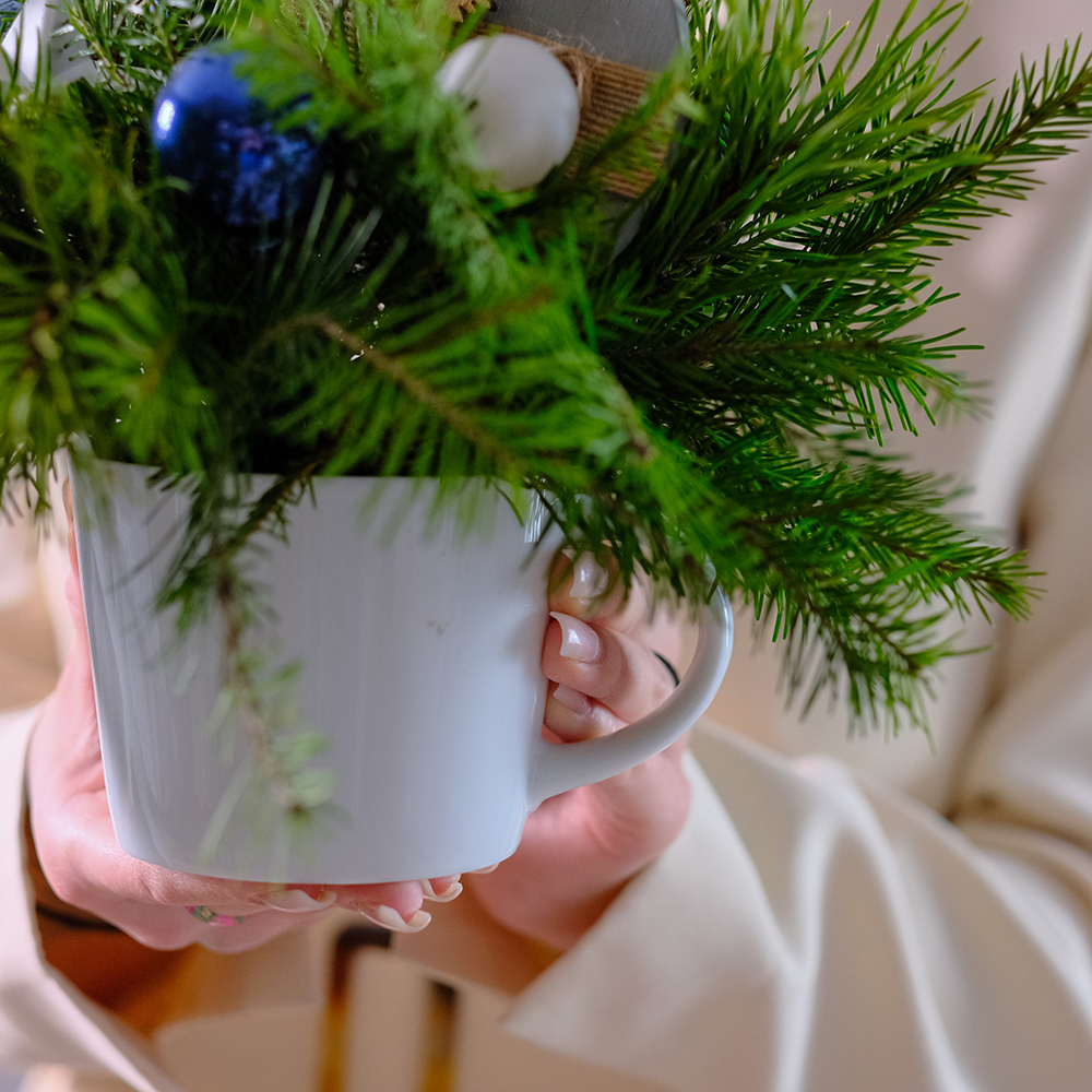 Зимняя композиция в кружке с еловыми ветвями, елочными шарами и декором.
