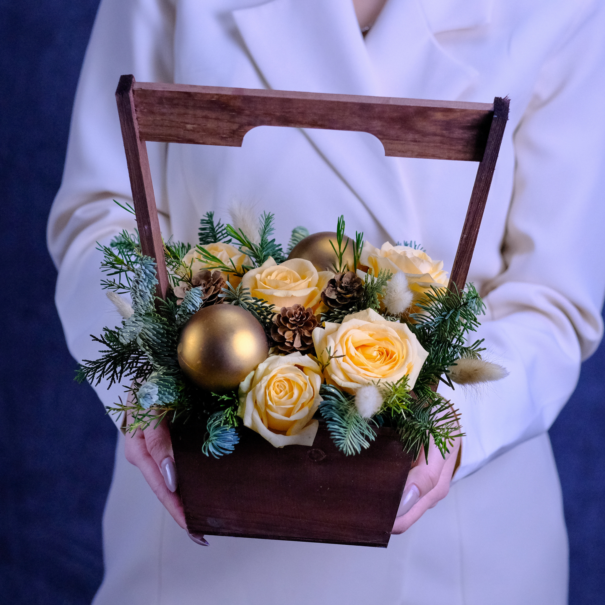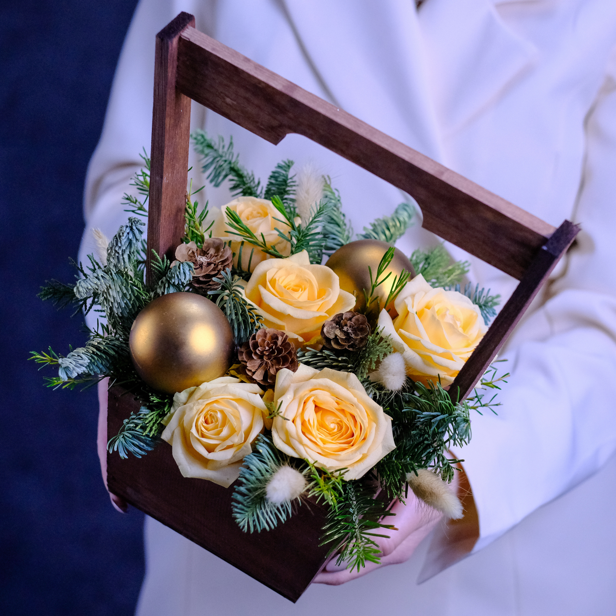 Зимняя композиция с живыми цветами в деревянном ящике.