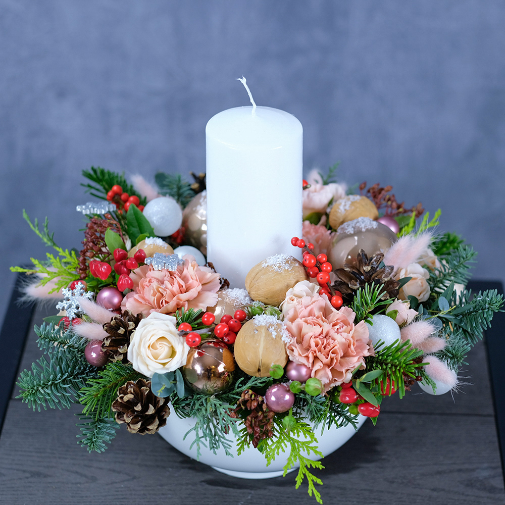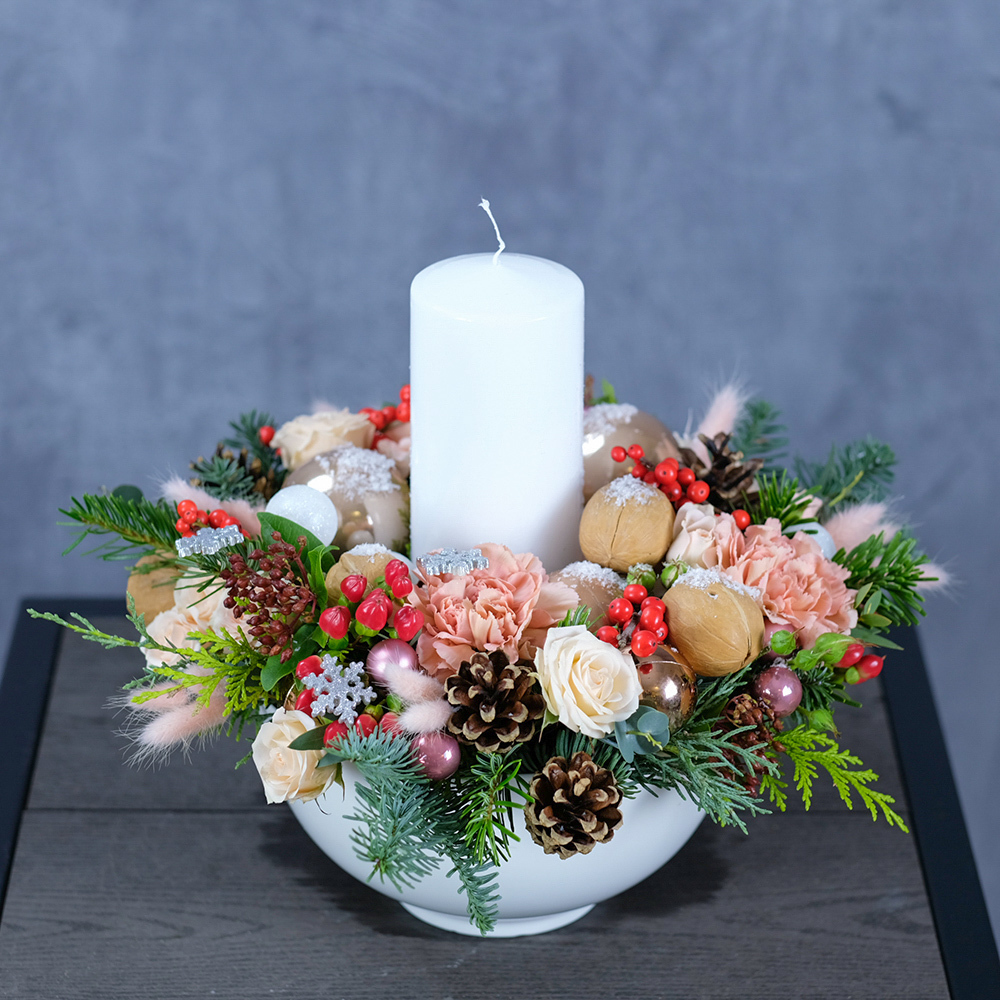 Зимняя композиция с живыми цветами и свечой «‎Орешки для золушки»